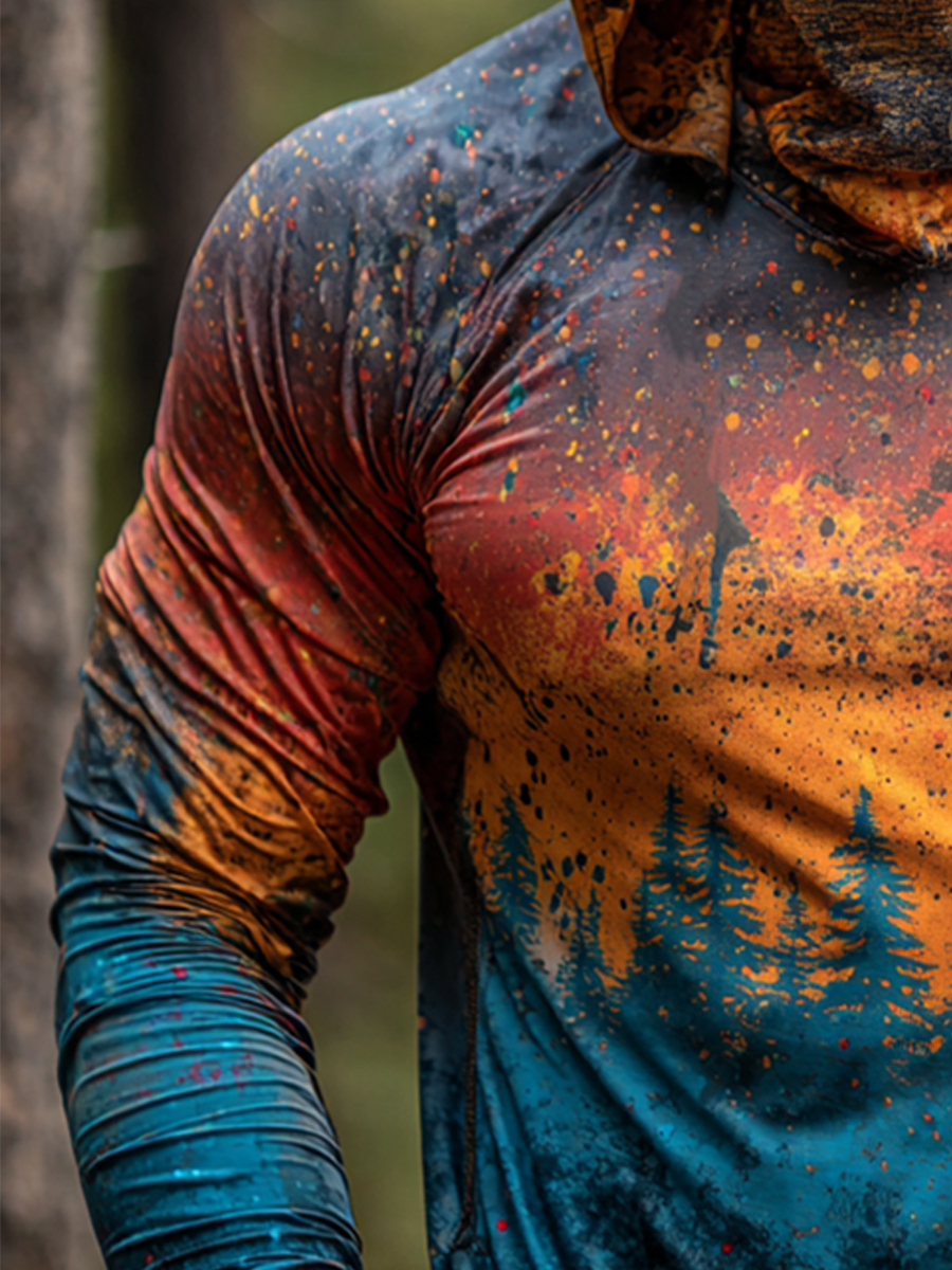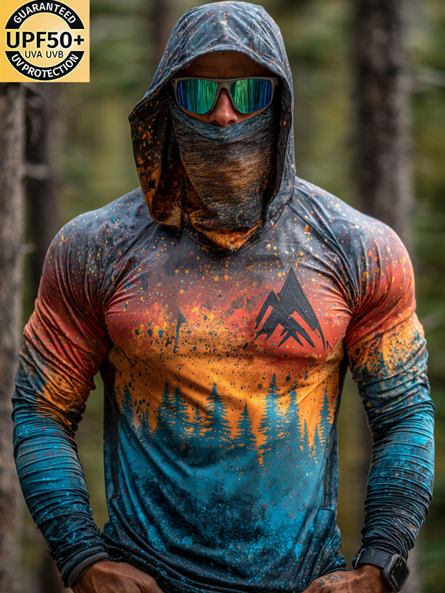 Men's Raglan Sleeve Finger Gloves Face Mask Colorblock Forest Print Sun Protection Hoodie