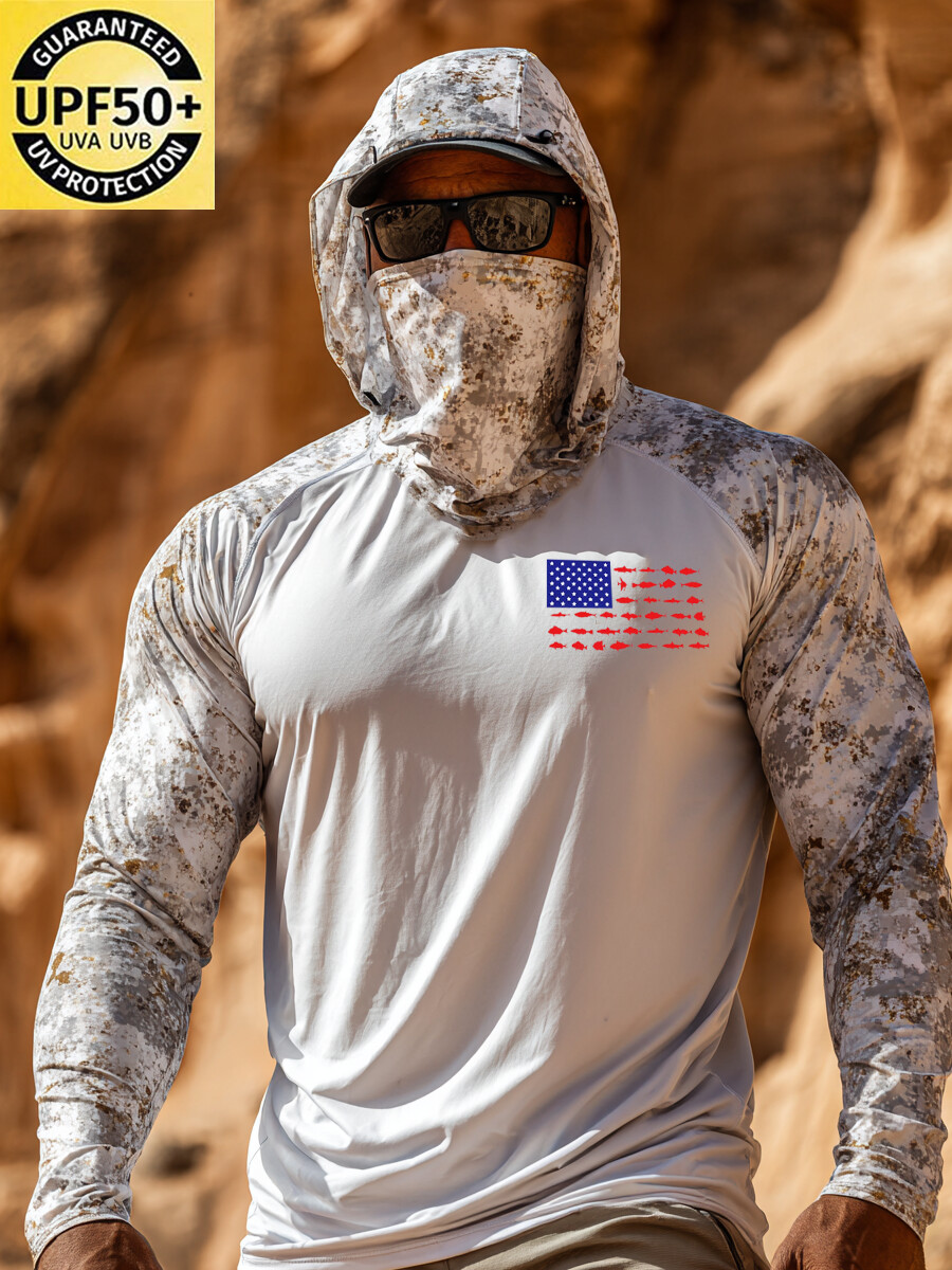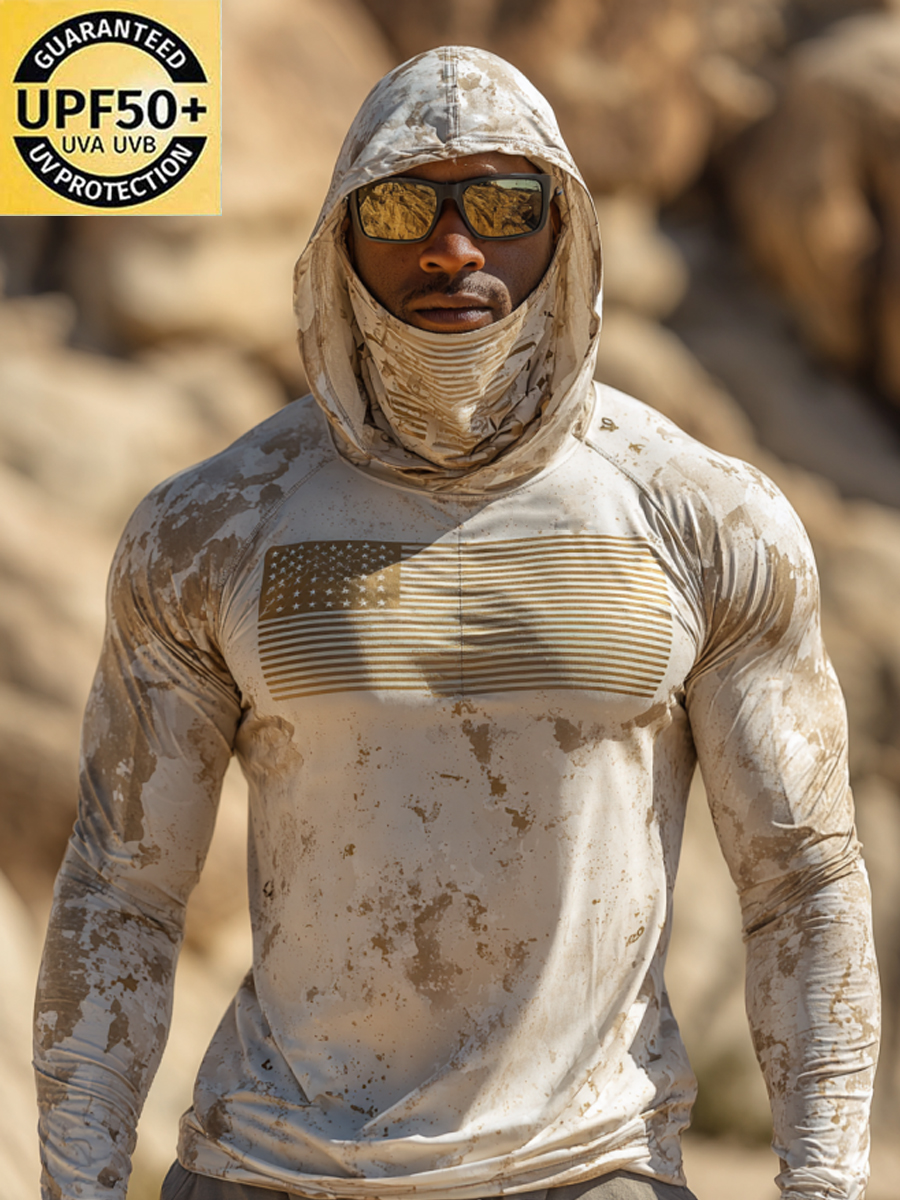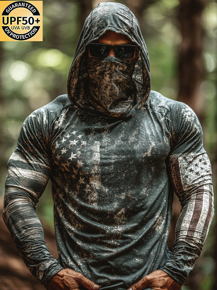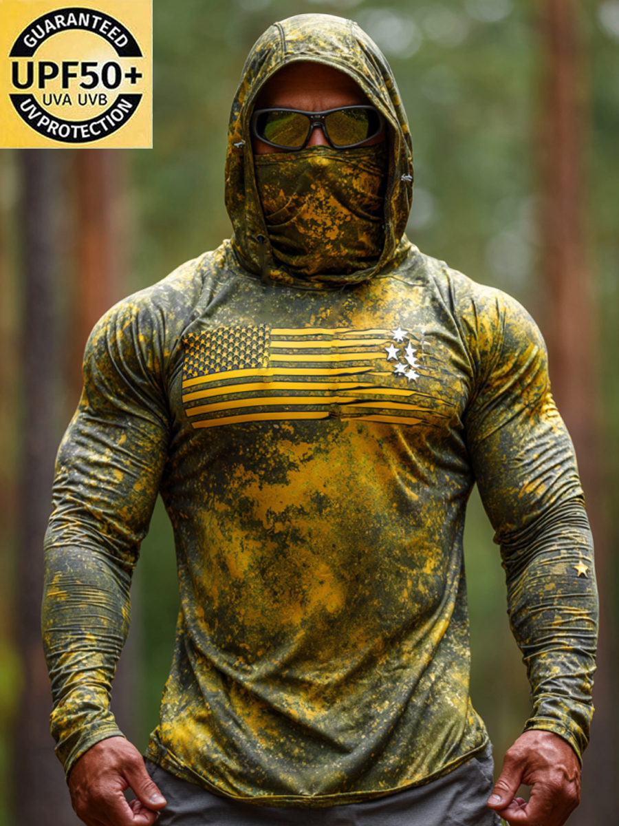 Men'S UPF 50+ Hoodie With Built-In Mask -Raglan Camouflage National Flag Pattern- Quick-Dry Performance Sun Hoodie