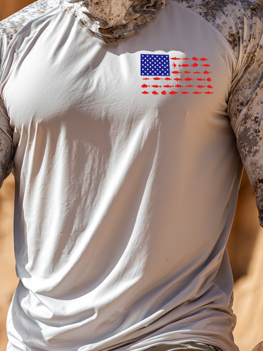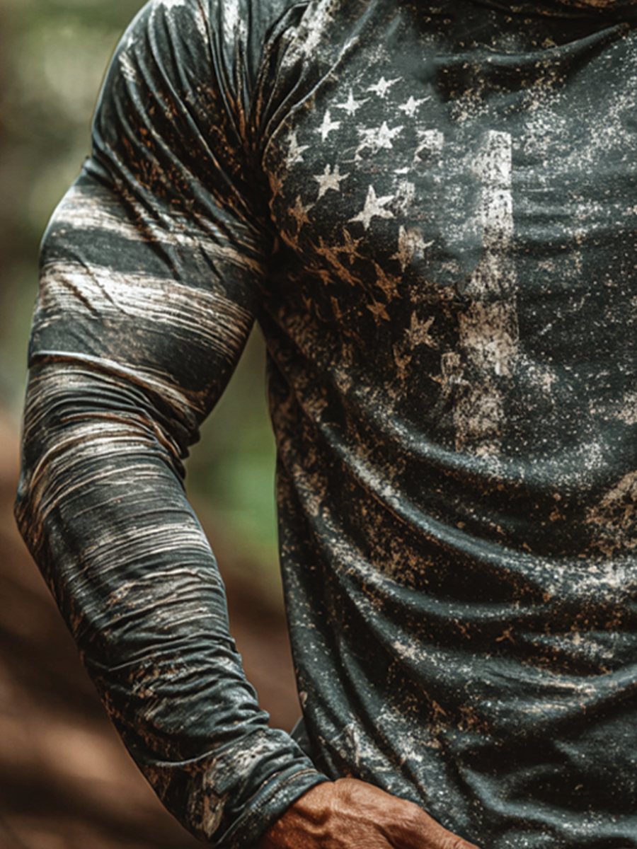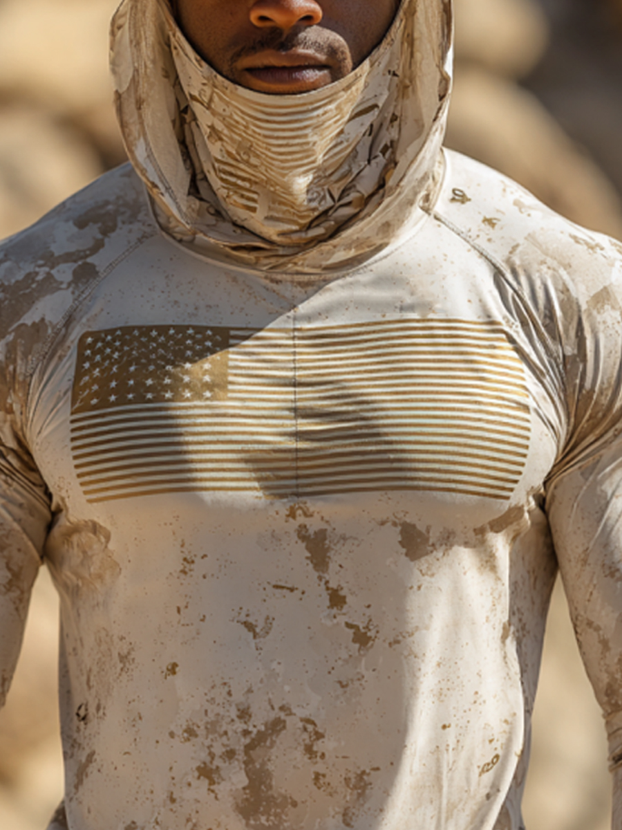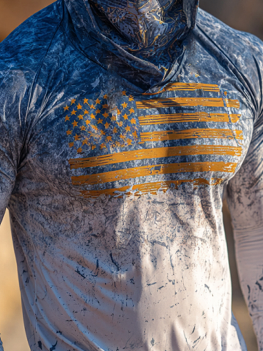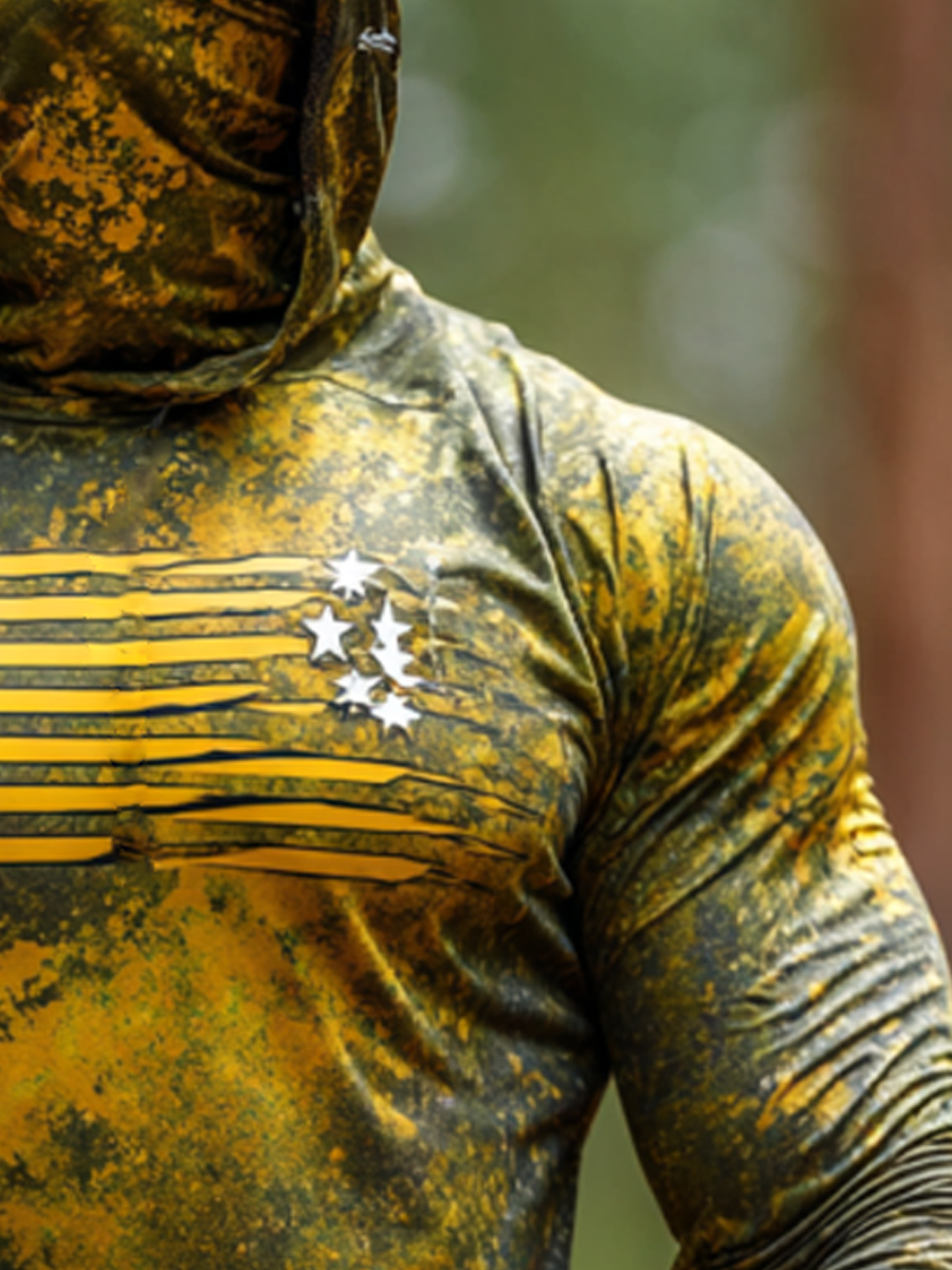 Men'S UPF 50+ Hoodie With Built-In Mask -Raglan Camouflage National Flag Pattern- Quick-Dry Performance Sun Hoodie