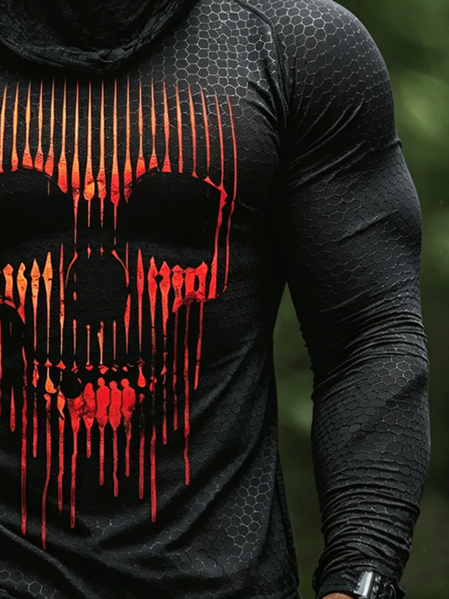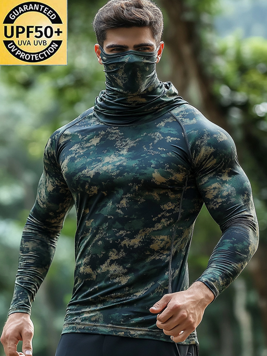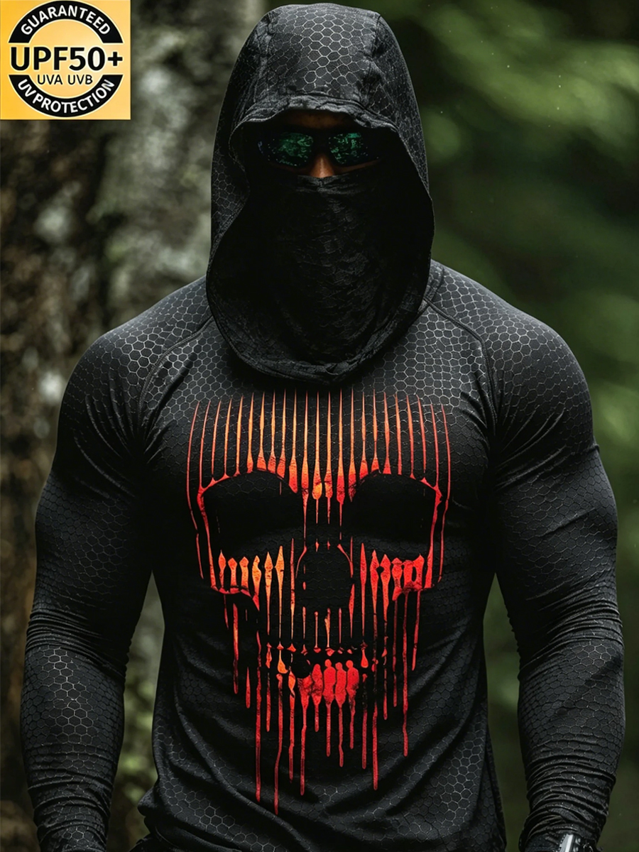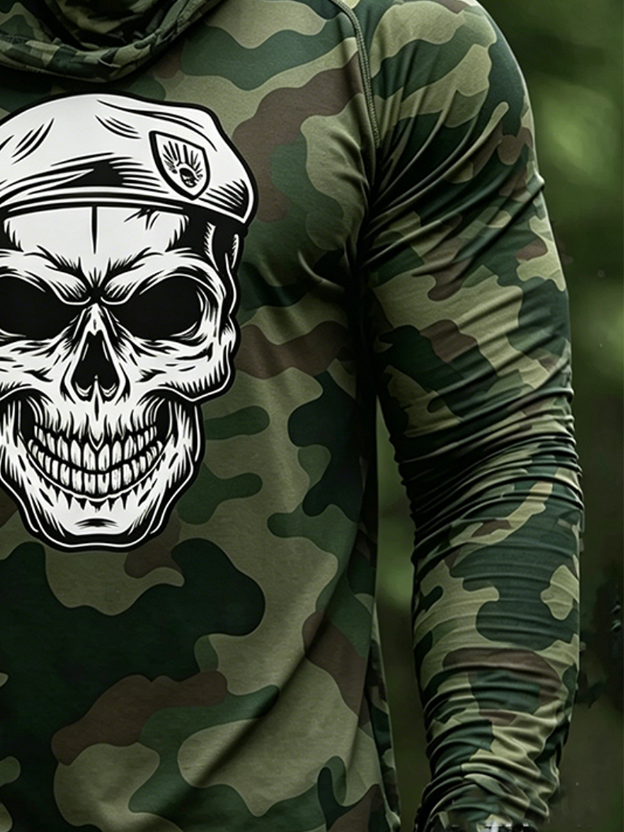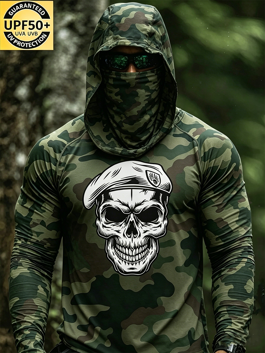 Men's Camouflage Sun Protection Hoodie, UPF50+ UV Protection, Built-in Face Mask, Skull Print, Quick-Drying and Breathable Outdoor Sun Protection Clothing