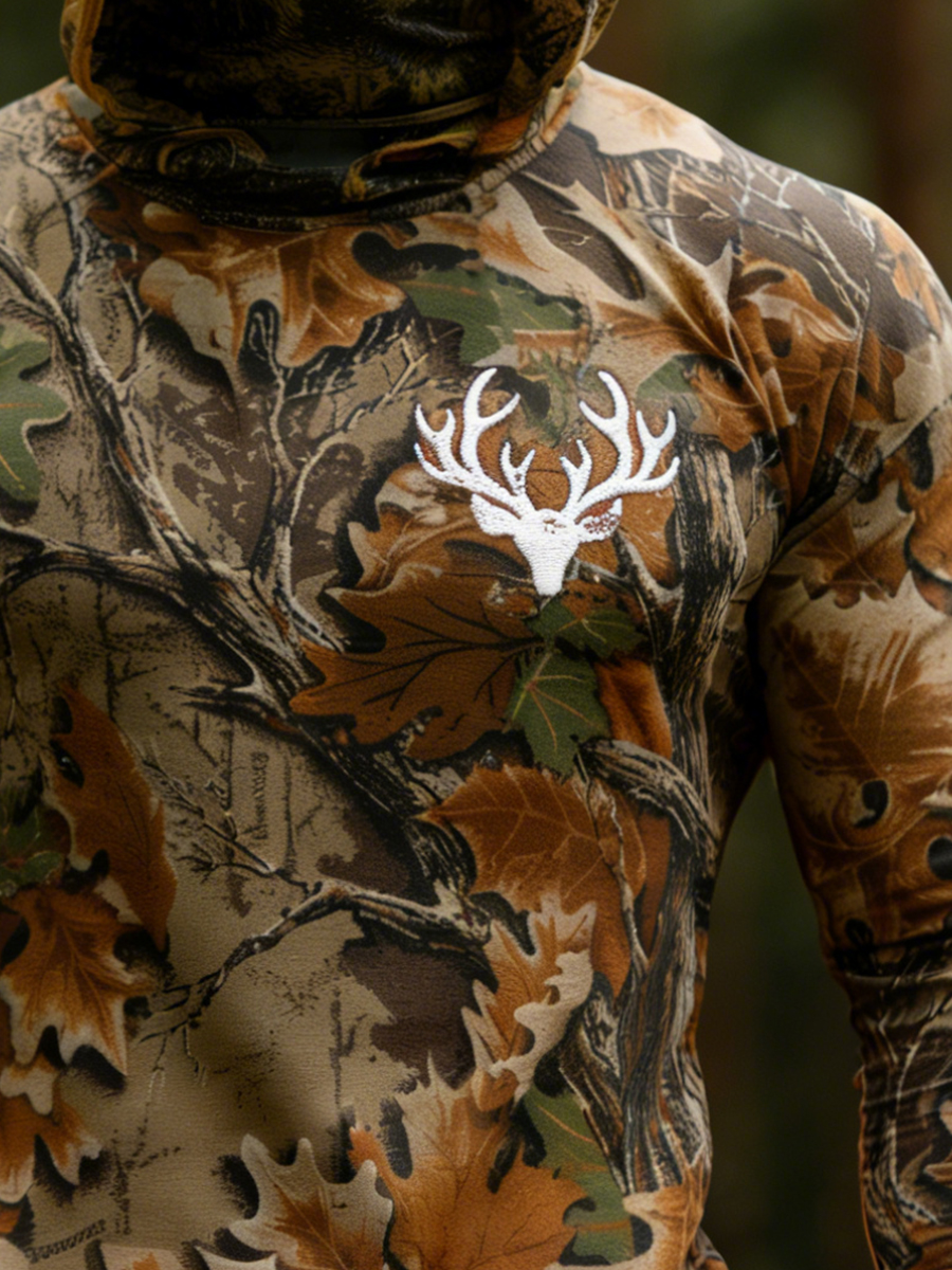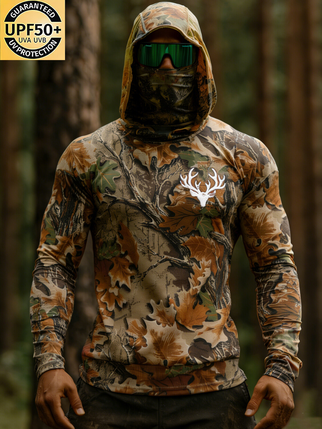 Men'S UPF 50+ Hoodie With Built-In Mask-Hunting Maple Leaf Camouflage Deer Antler Pattern- Quick-Dry Performance Sun Hoodie
