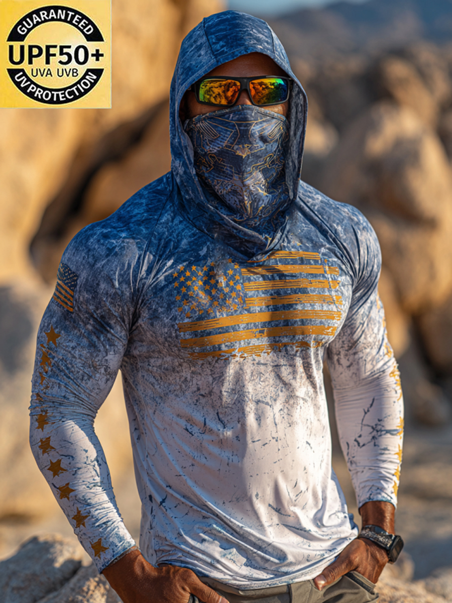 Men's Raglan Sleeve Finger Gloves Face Mask American Flag Gradient Print Sun Protection Hoodie