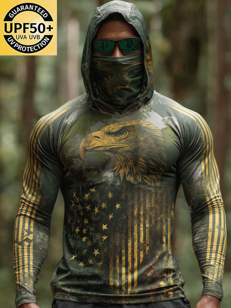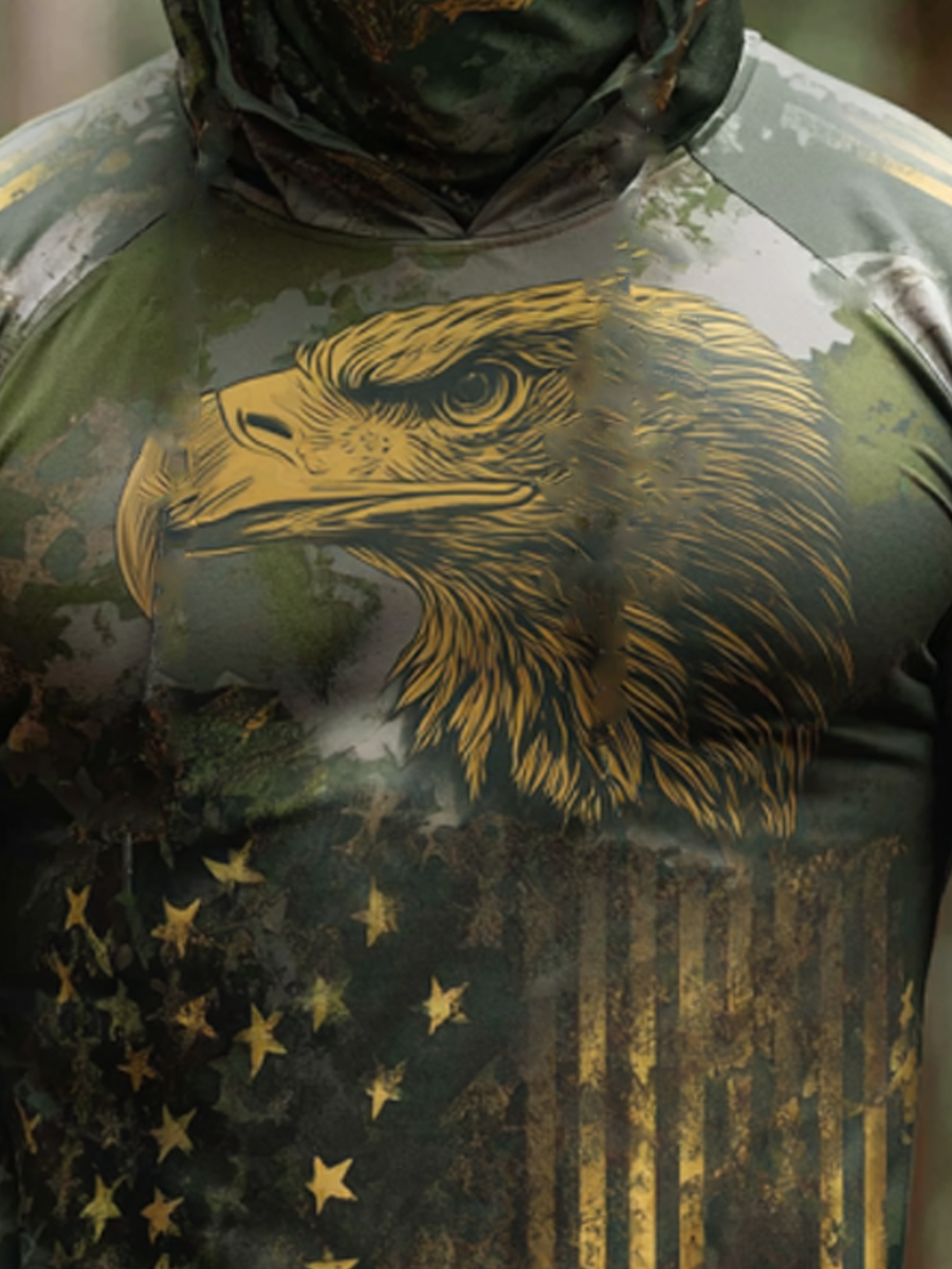 Men's Raglan Sleeve Finger Gloves Face Mask Eagle Camouflage Print Sun Protection Hoodie