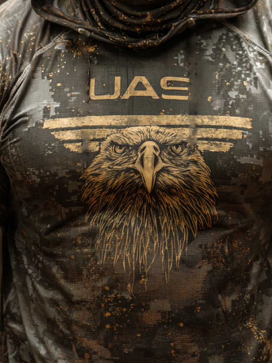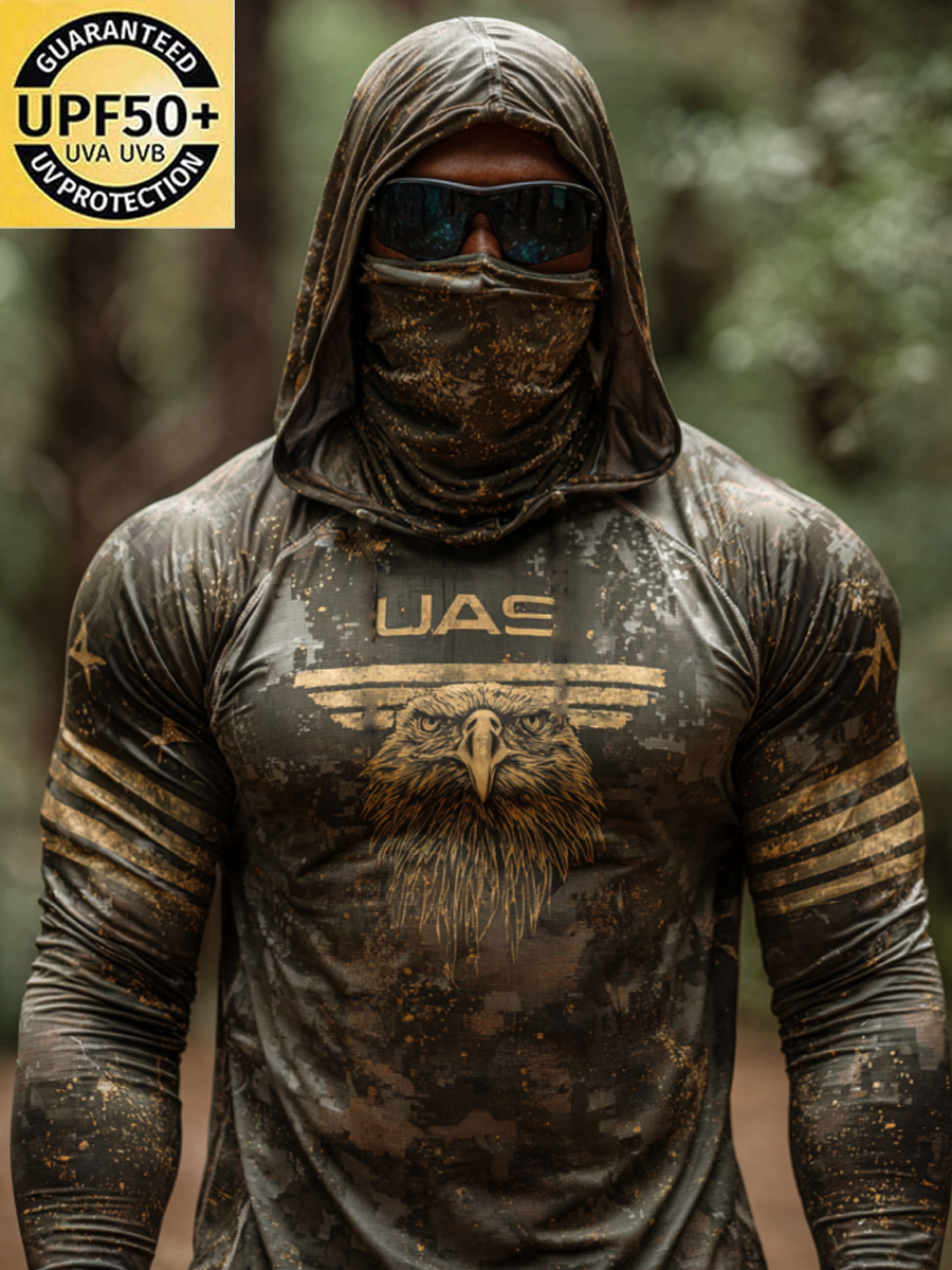 Men'S Raglan Sleeve Finger Gloves Face Mask Forest Camouflage Eagle Print Sun Protection Hoodie