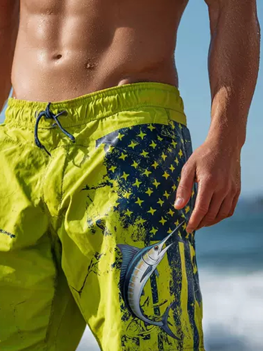 Men's Marlin Fish Stars and Stripes Print Beach Casual Quick-Drying Shorts