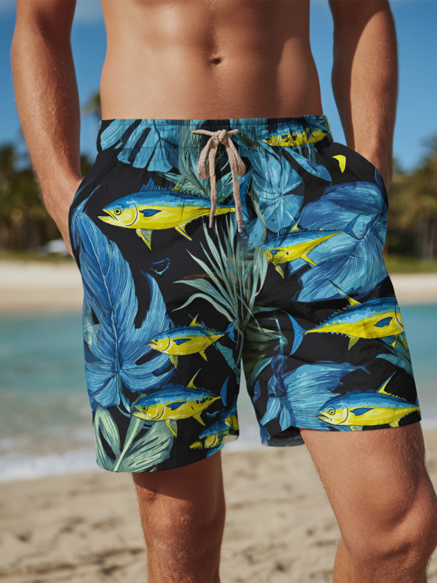 Men's Ocean Blue Leaf Bright Yellow Blue Tuna Fish Print Beach Casual Quick-Drying Shorts