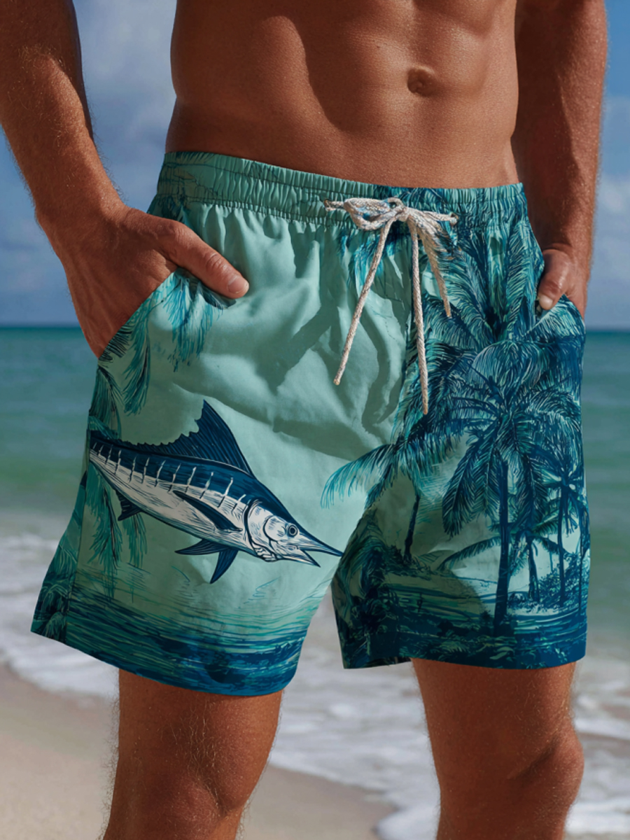 Men's Tropical Palm Tree Marlin Fish Print Beach Casual Quick-Drying Shorts