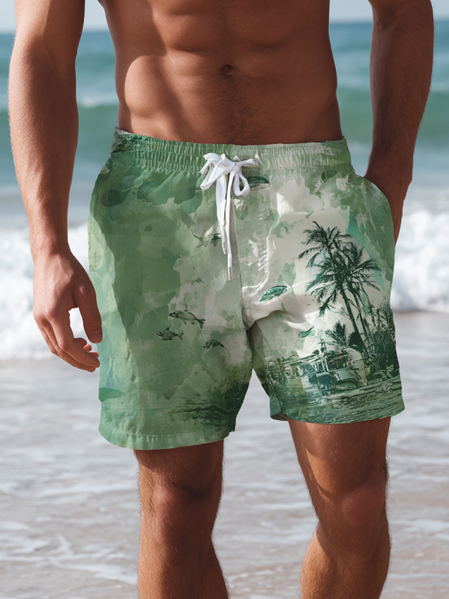 Men's Watercolor Palm Tree Island Fish Print Beach Casual Quick-Drying Shorts
