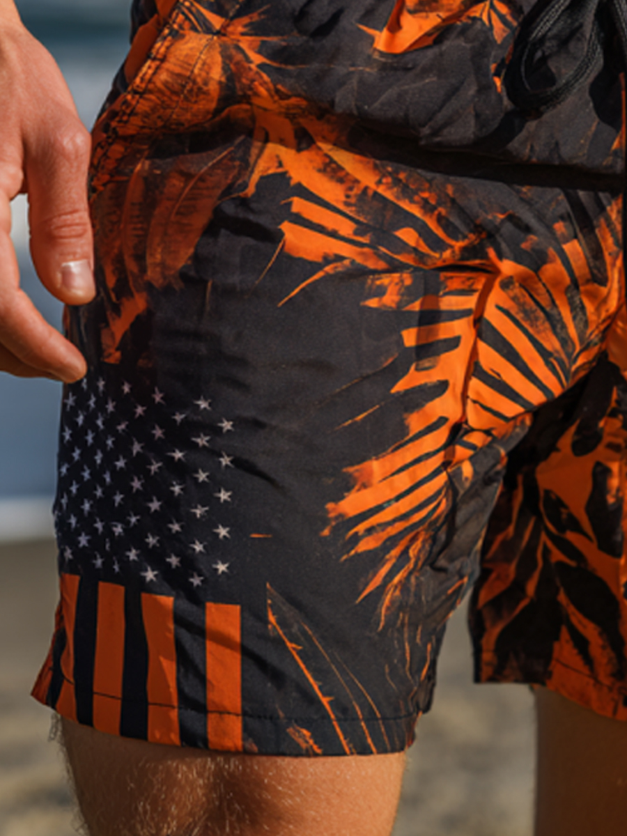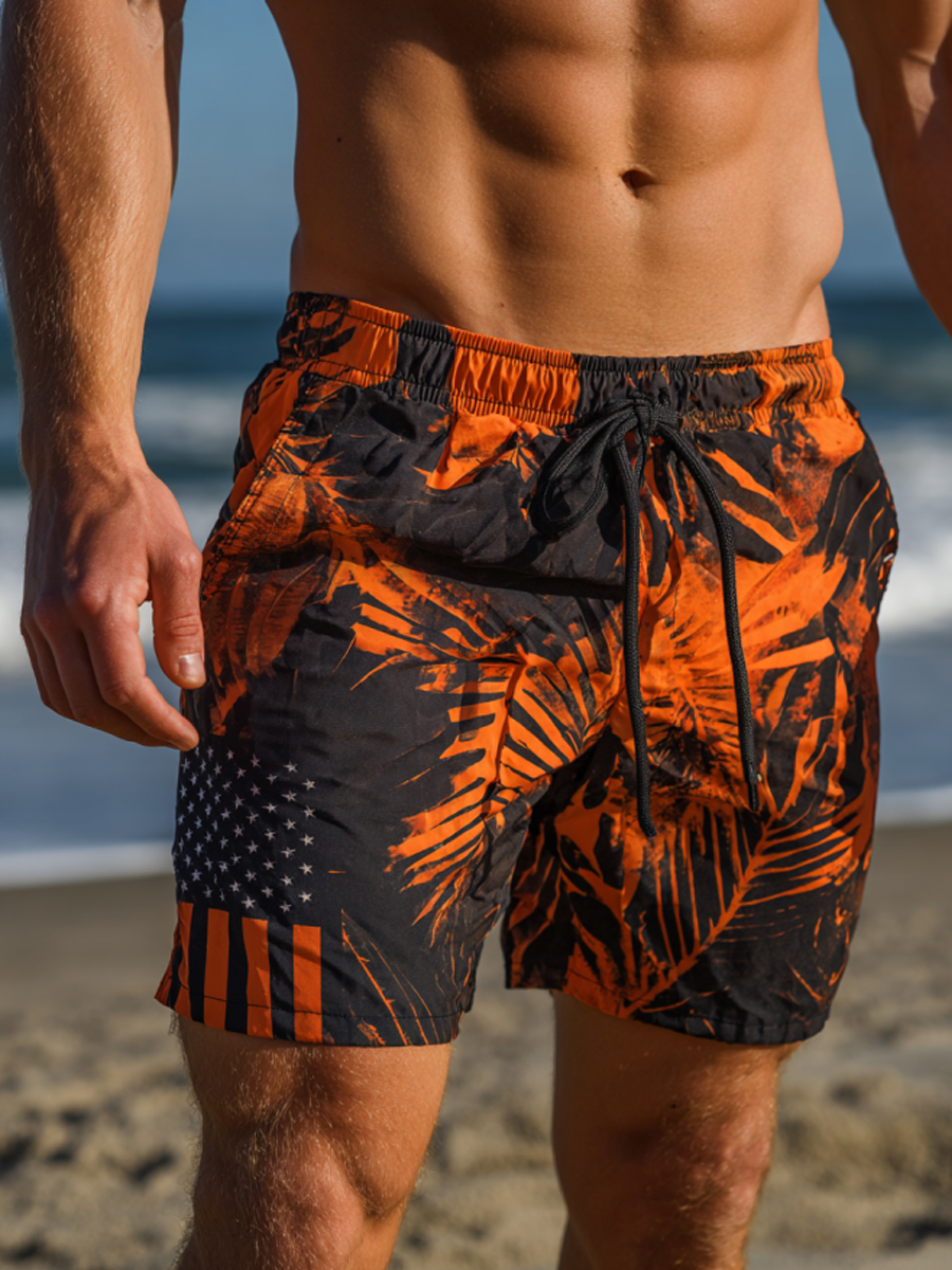 Men's Vibrant Orange Palm Leaf Flag Print Beach Casual Quick-Drying Shorts