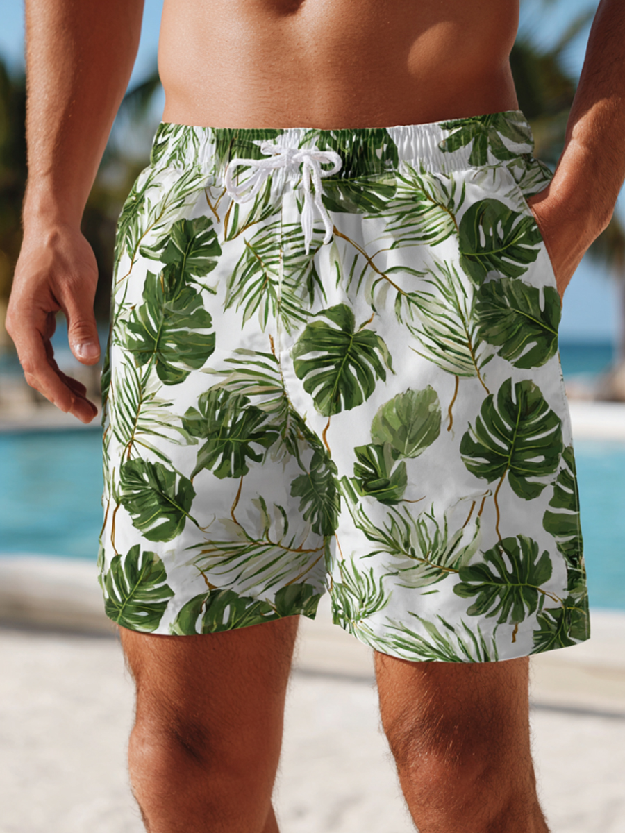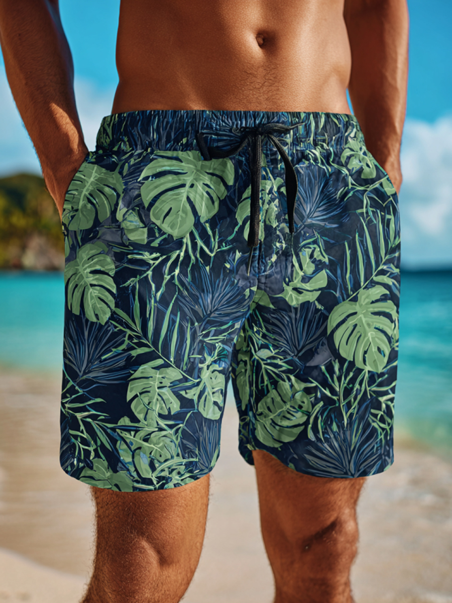 Men's Fresh Green Tropical Foliage Print Beach Casual Quick-Drying Shorts