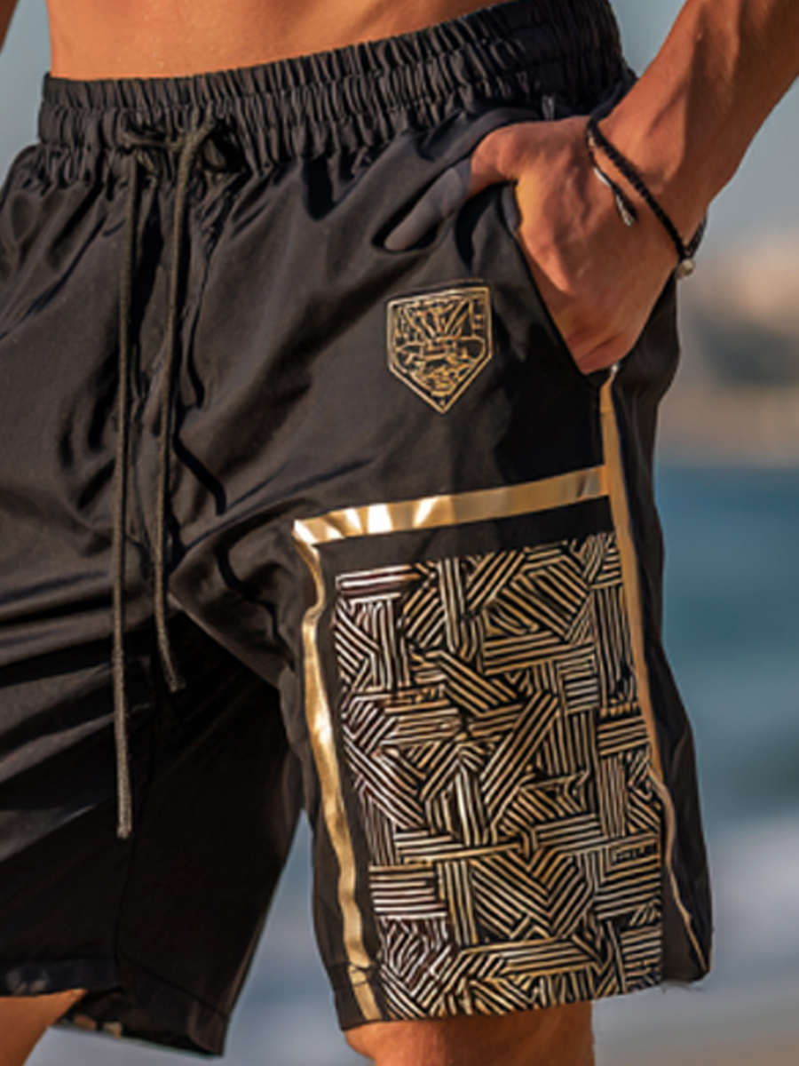 Men's Black Base Gold Geometric Pattern Print Beach Casual Quick-Drying Shorts