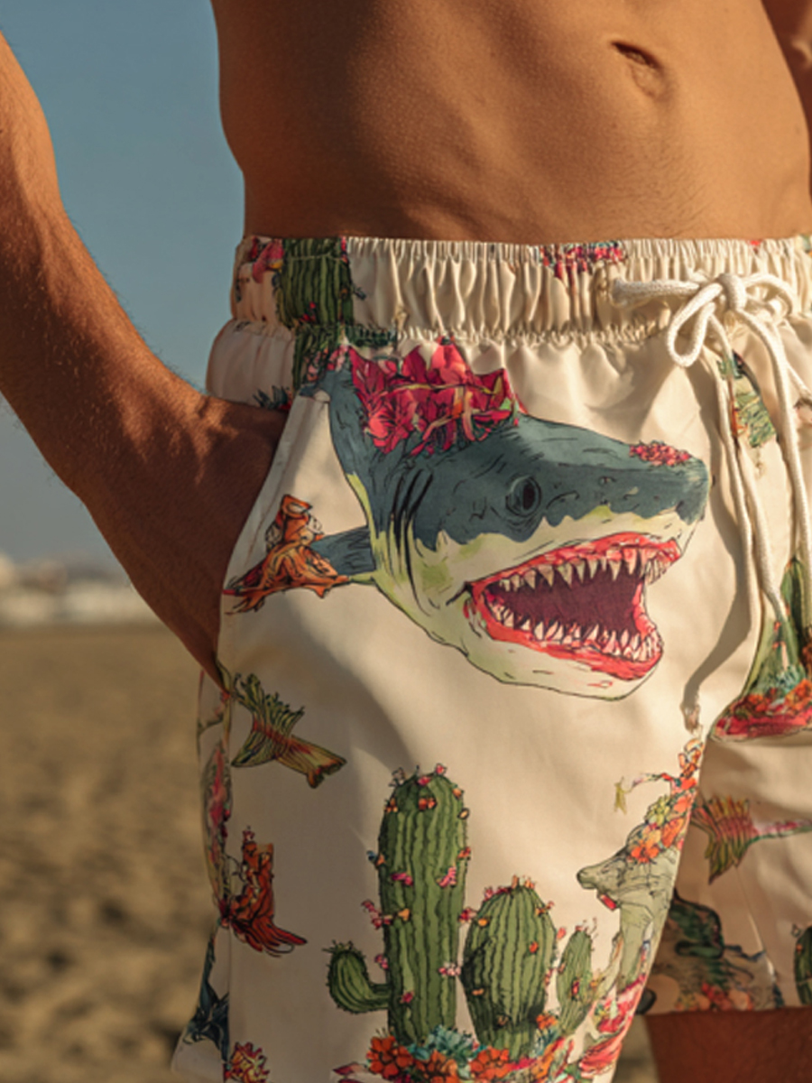 Men's Creative Contrast Desert Marine Life Print Beach Casual Quick-Drying Shorts