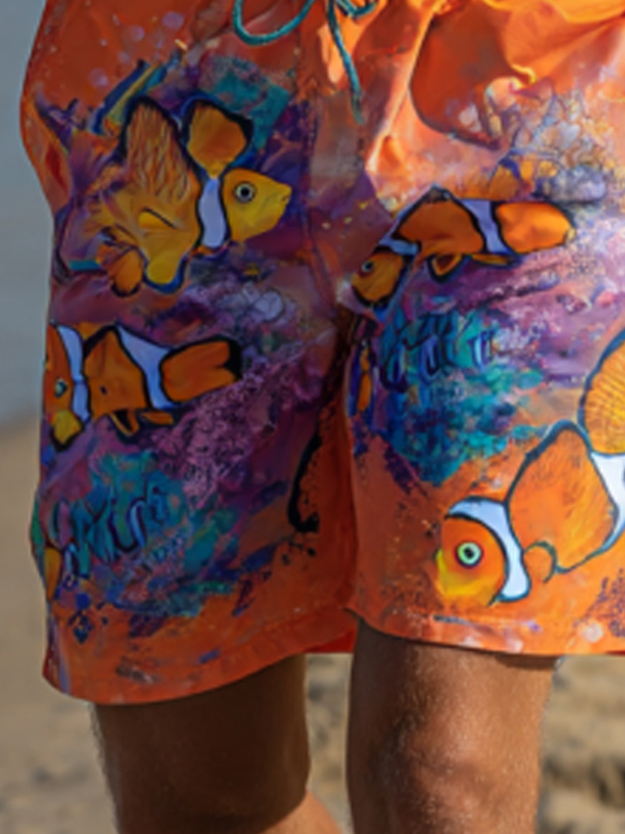 Men's Vibrant Graffiti Ocean Fish Graphic Print Beach Casual Quick-Drying Shorts