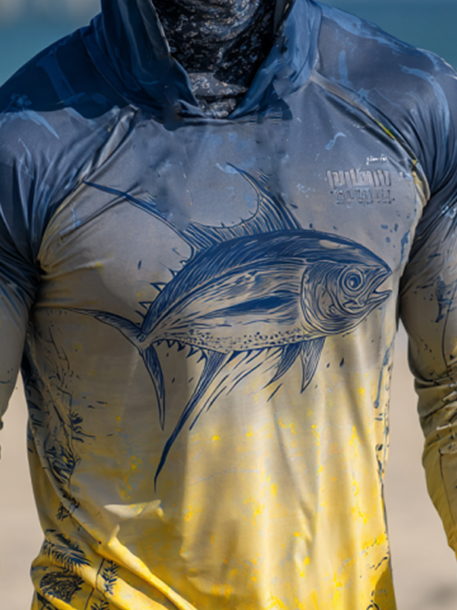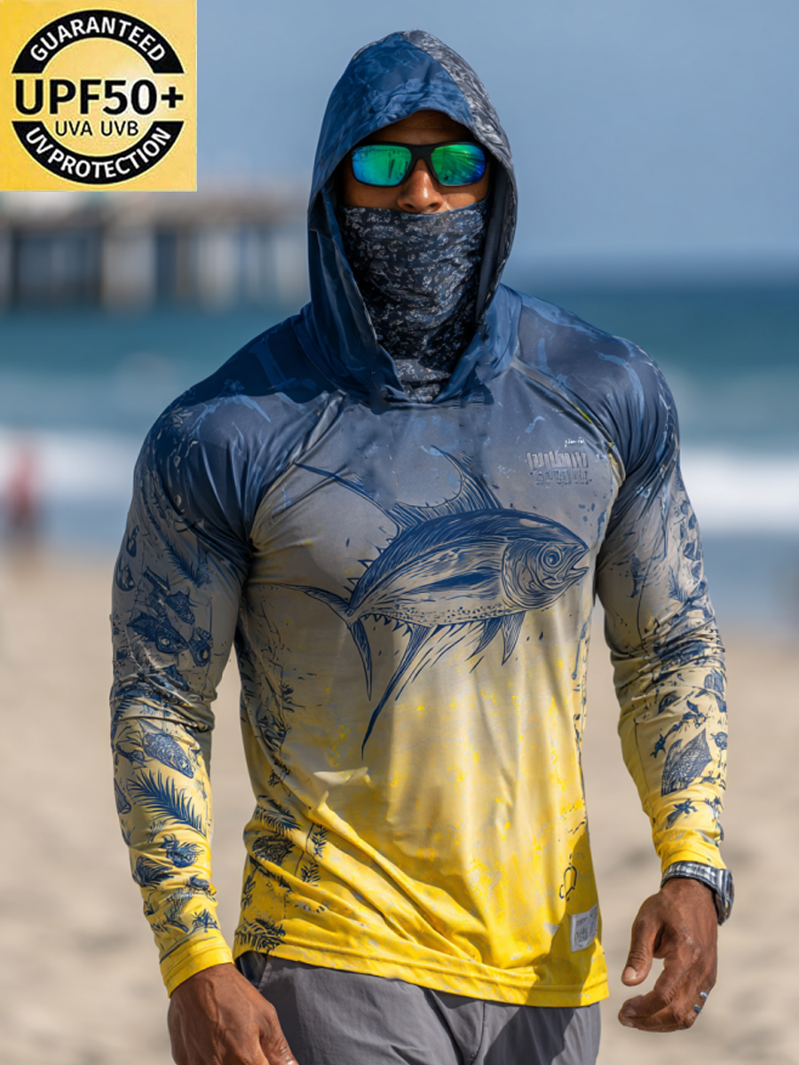 Men's Raglan Sleeve Finger Gloves Face Mask with Gradient Fish Print Sun Protection Hoodie