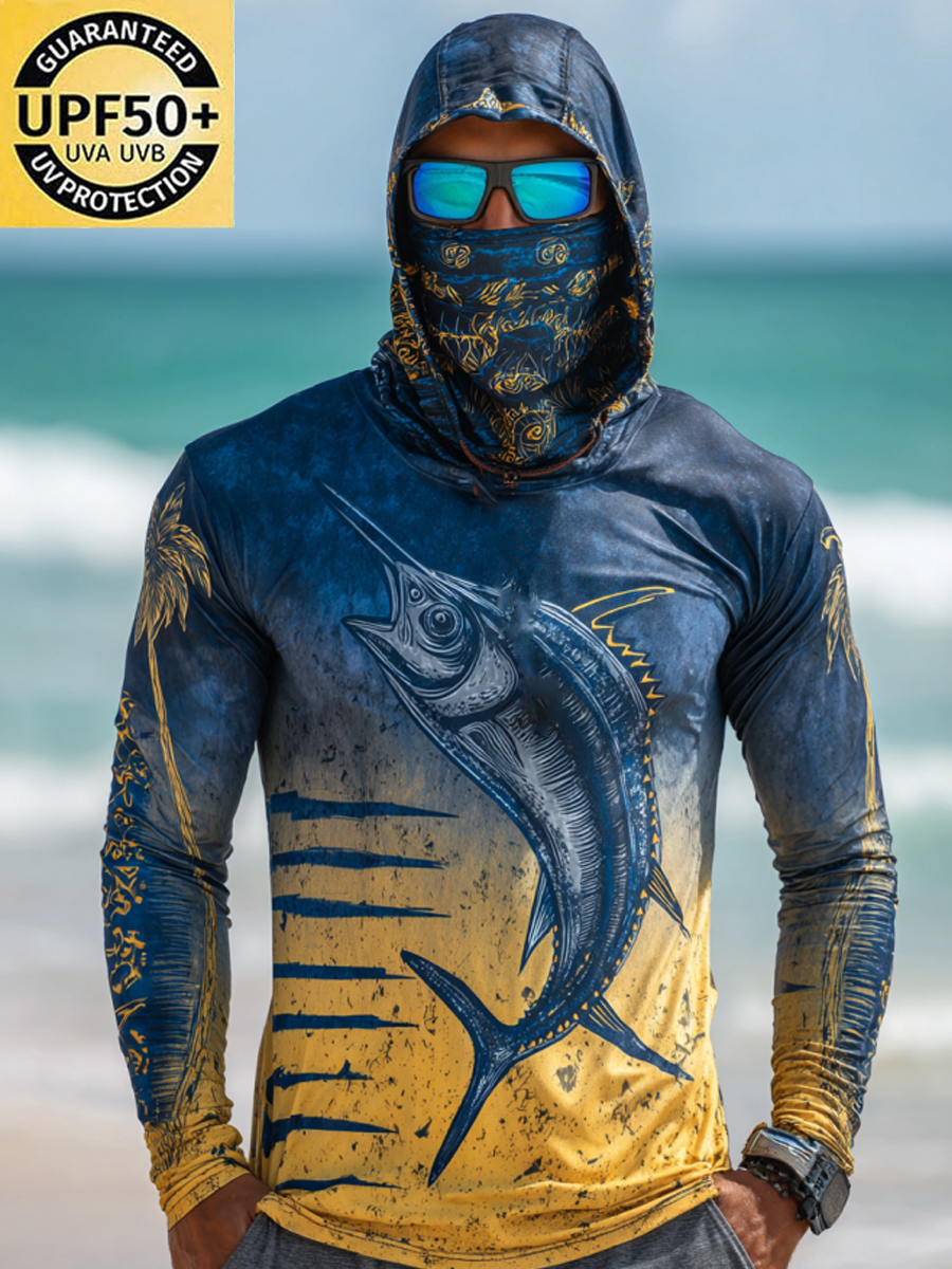 Men's Raglan Sleeve Finger Gloves Face Mask Swordfish Gradient Print Sun Protection Hoodie