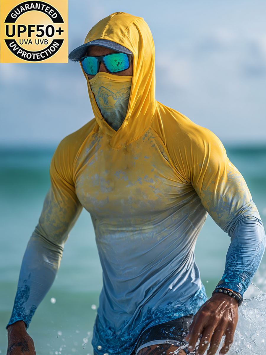 Men's Outdoor Sun Protection Breathable Cool Mask Yellow Blue Gradient Camo Print Hooded Sun Protection Long Sleeve Top