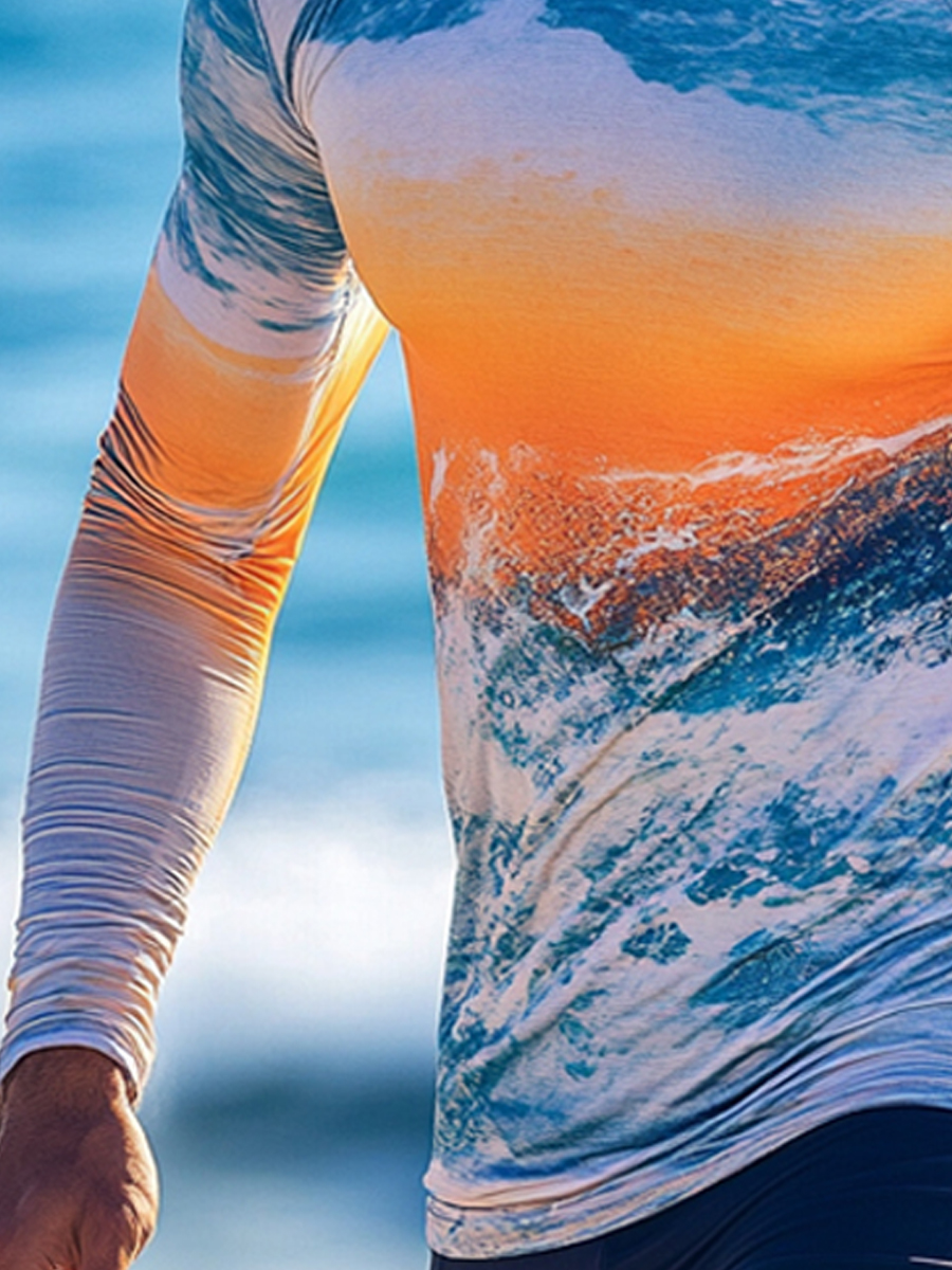 Men's Raglan Sleeve Finger Gloves Face Mask Ocean Sunset Wave Landscape Print Sun Protection Hoodie