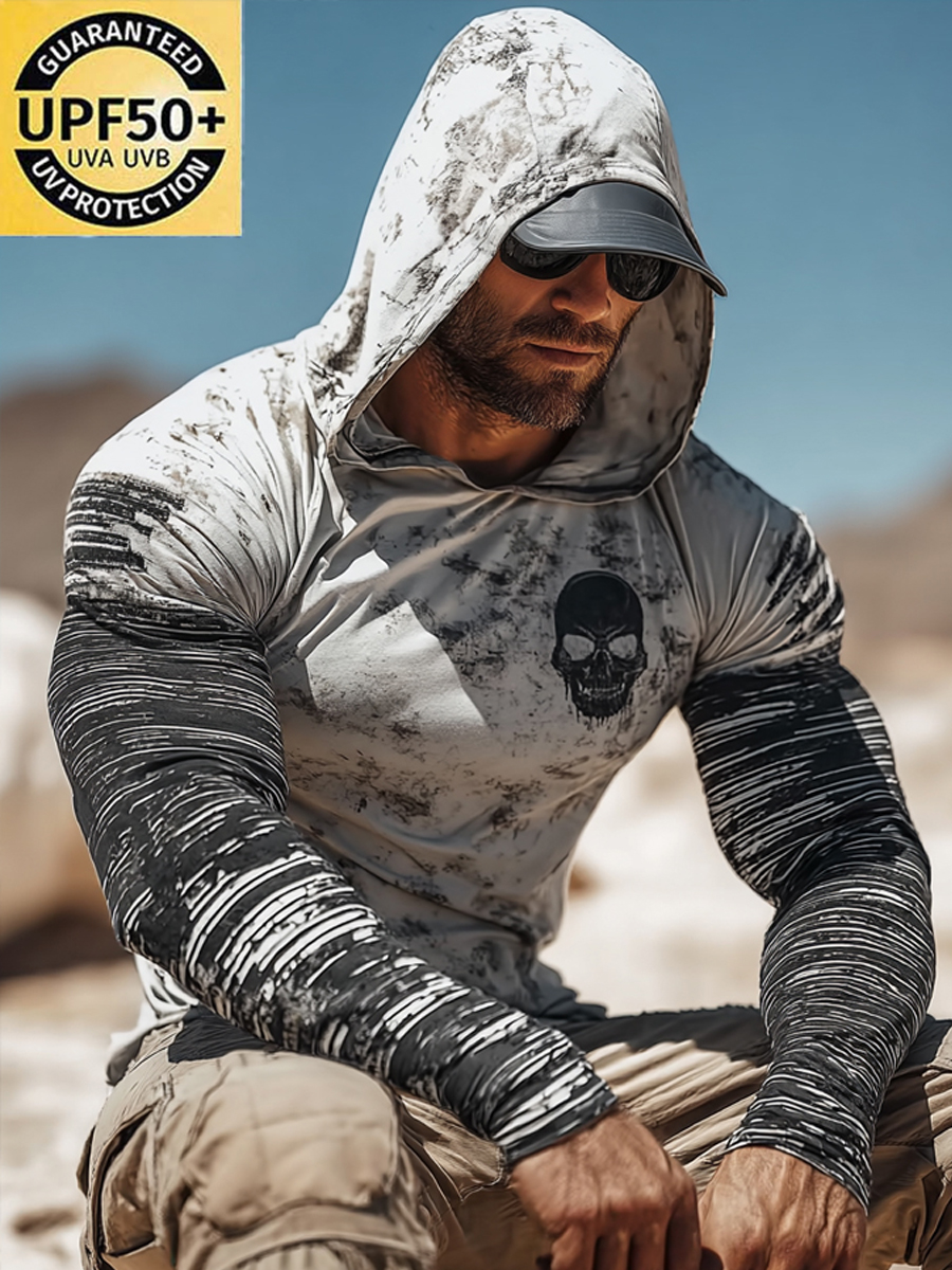 Men's Raglan Sleeve Finger Gloves Skull Print Sun Protection Hoodie