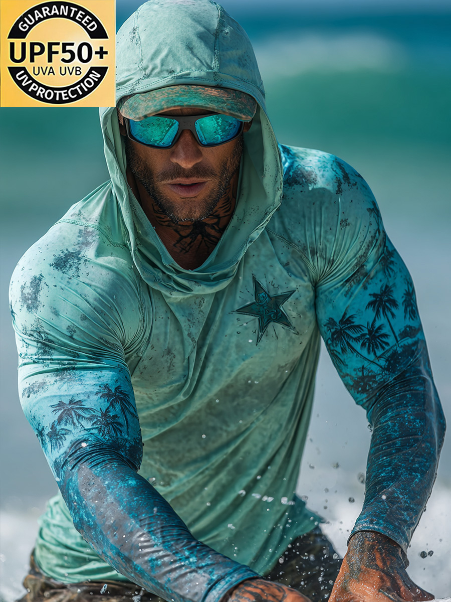 Men's Raglan Sleeve Finger Gloves Tropical Palm Tree Star Splash Print Sun Protection Hoodie