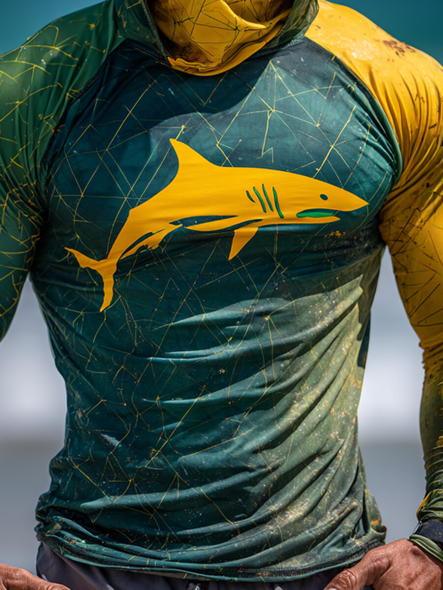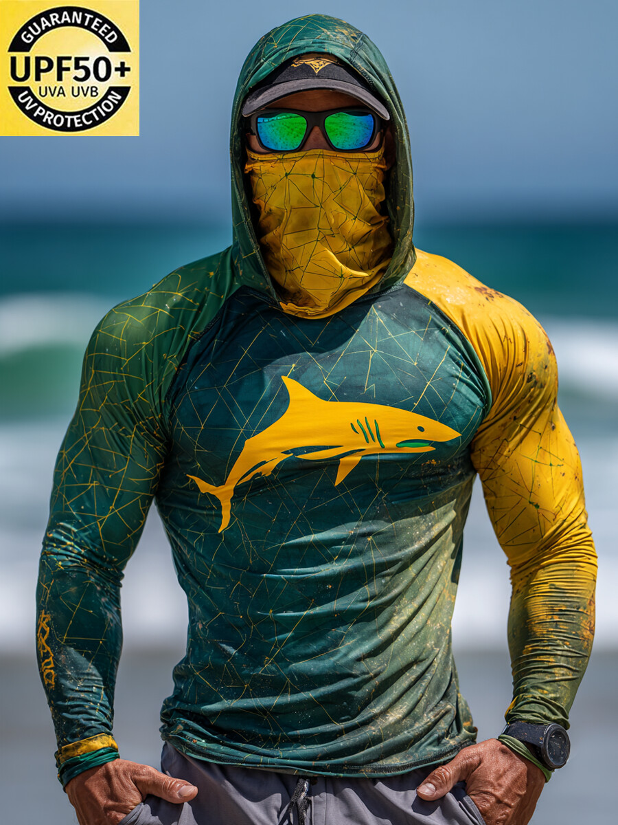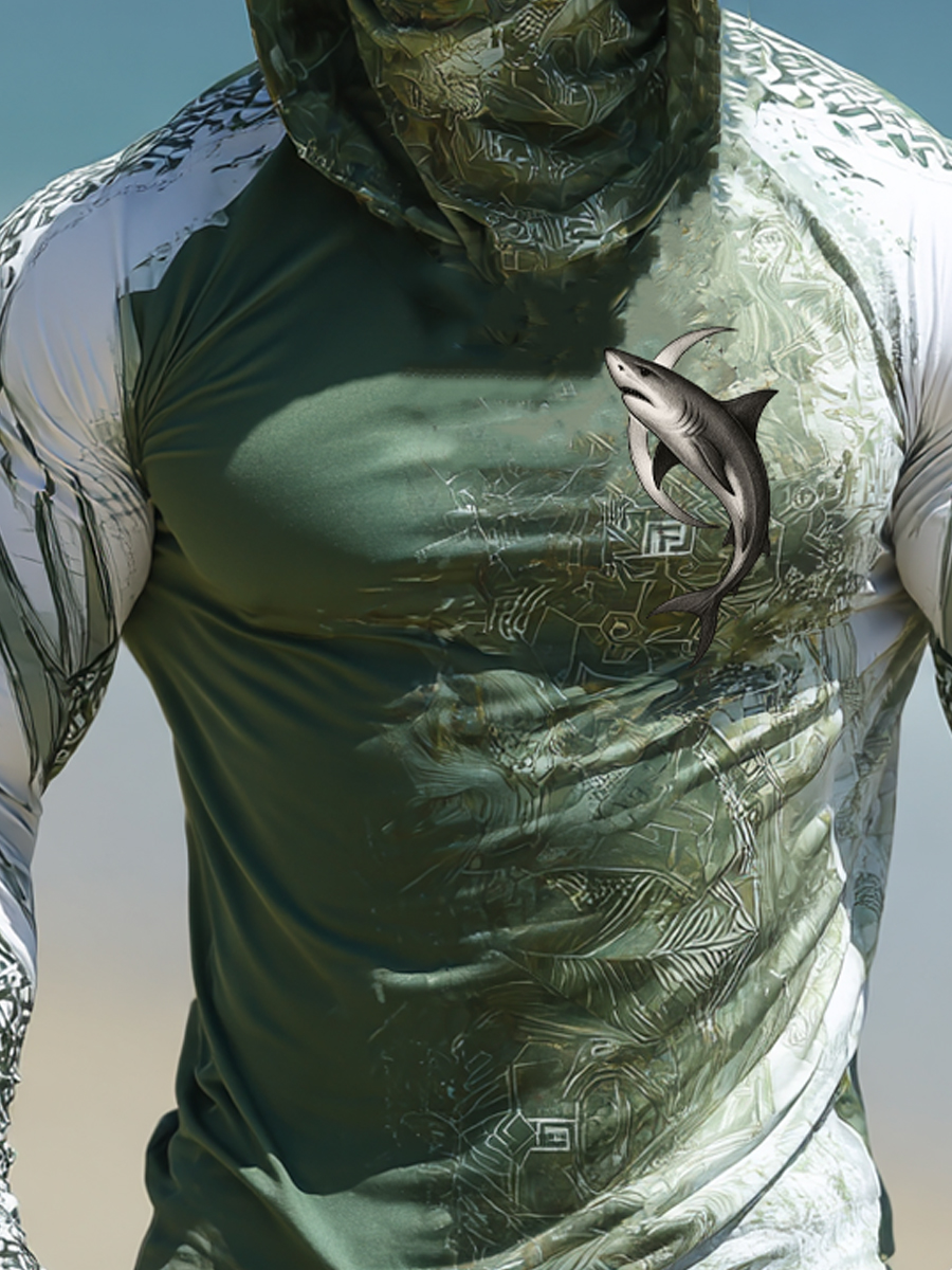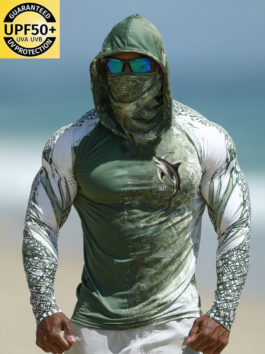 Men's Raglan Sleeve Finger Gloves Face Mask Shark Print Sun Protection Hoodie$34.98 USD$43.75 USD