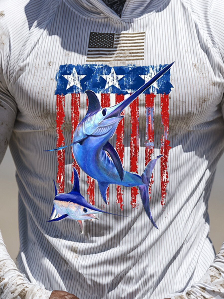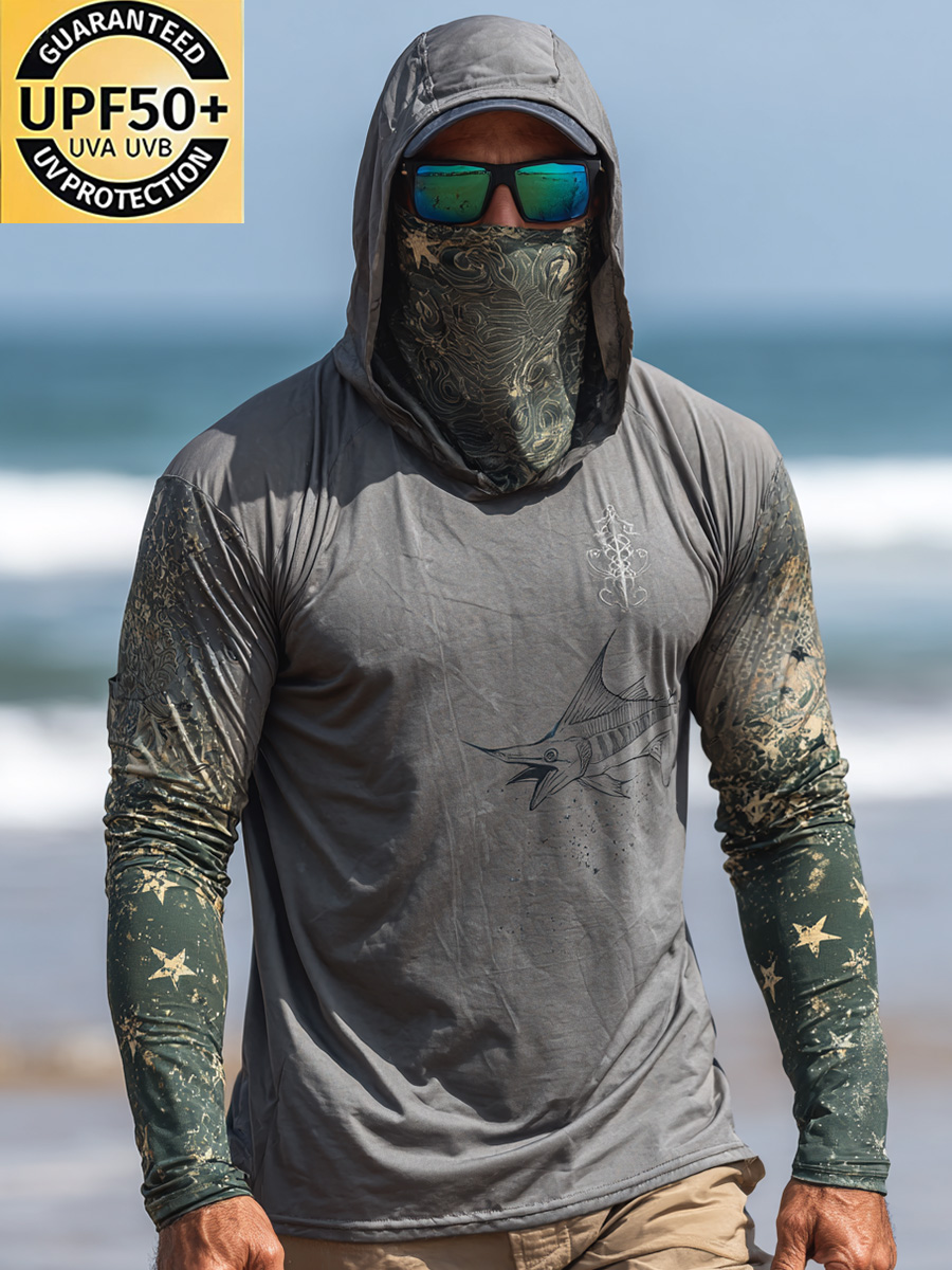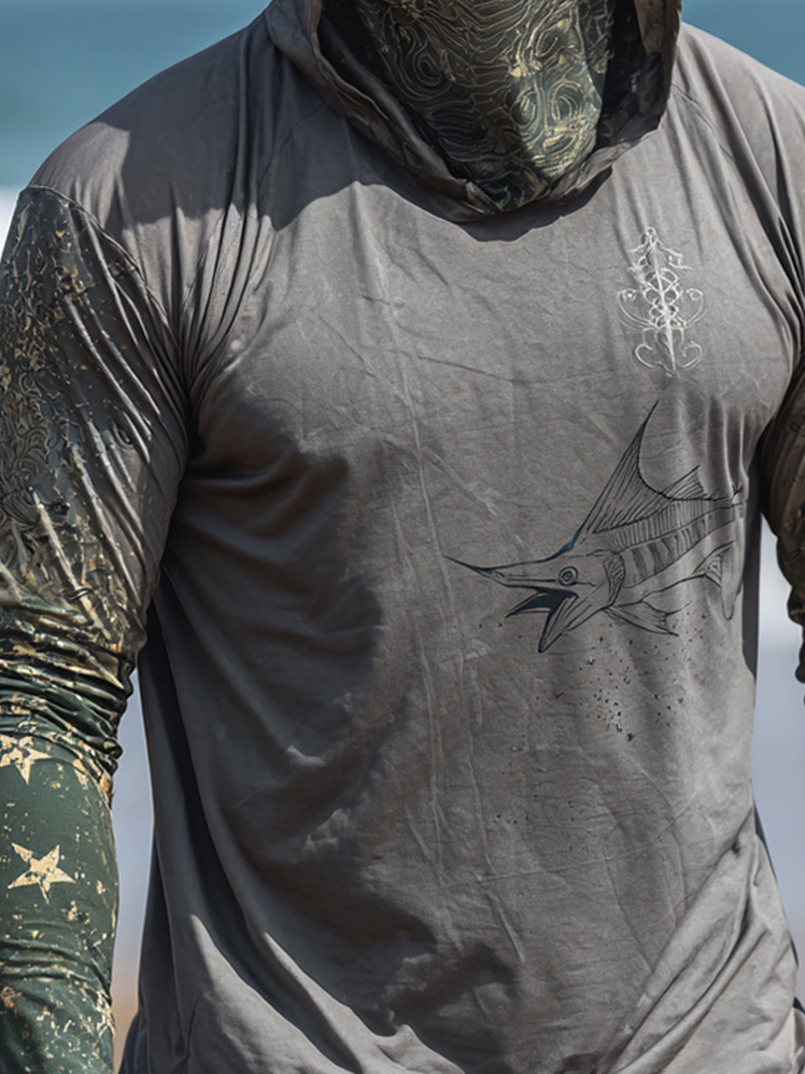 Men's Raglan Sleeve Finger Gloves Face Mask Swordfish Print Sun Protection Hoodie$34.98 USD$43.75 USD