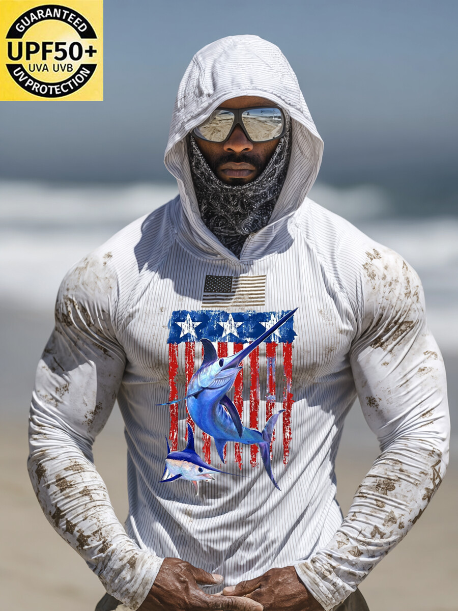 Men's Raglan Sleeve Finger Gloves Face Mask Swordfish Flag Print Sun Protection Hoodie$34.98 USD$43.75 USD