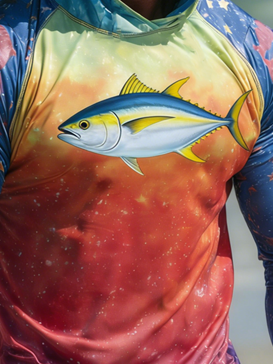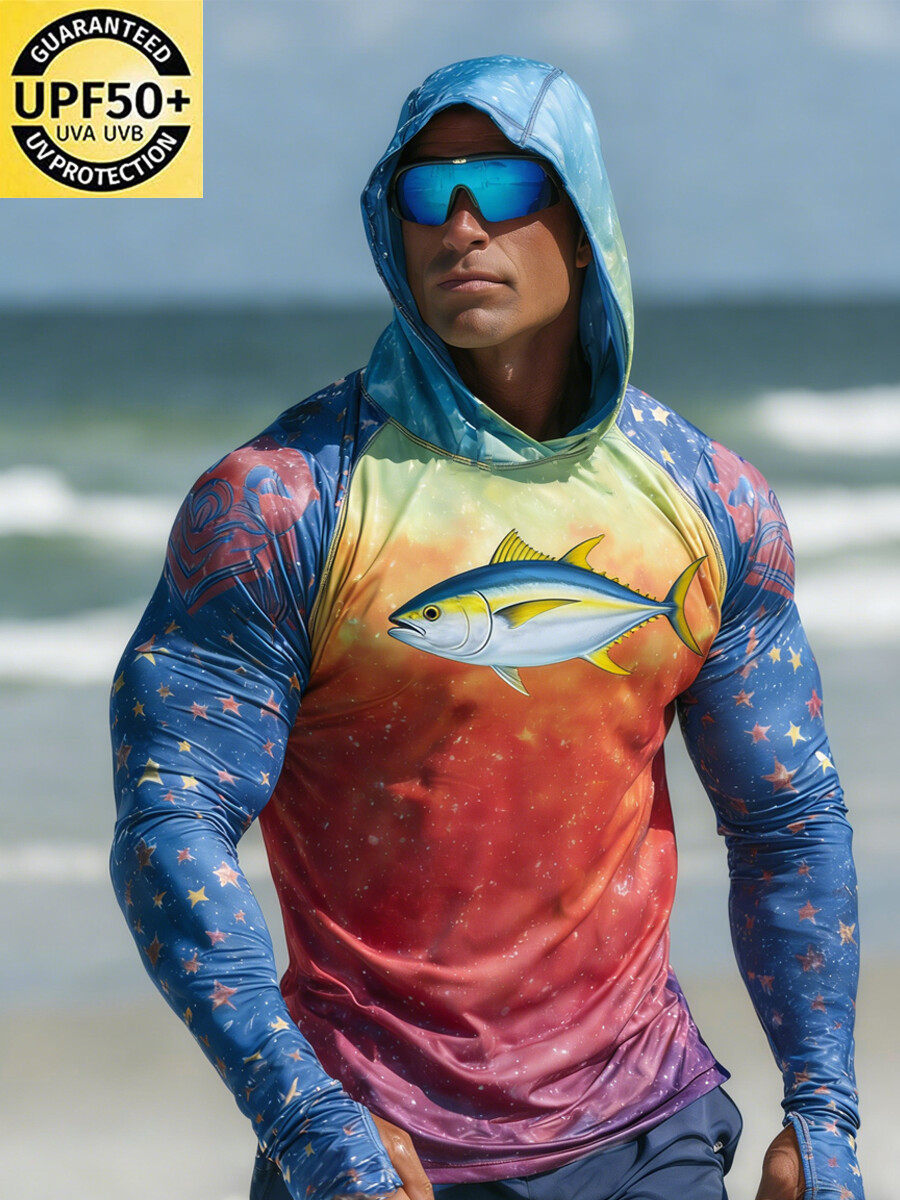 Men'S Raglan Sleeve Finger Gloves Face Mask Fish Stars Ombre Print Sun Protection Hoodie$32.98 USD$41.75 USD