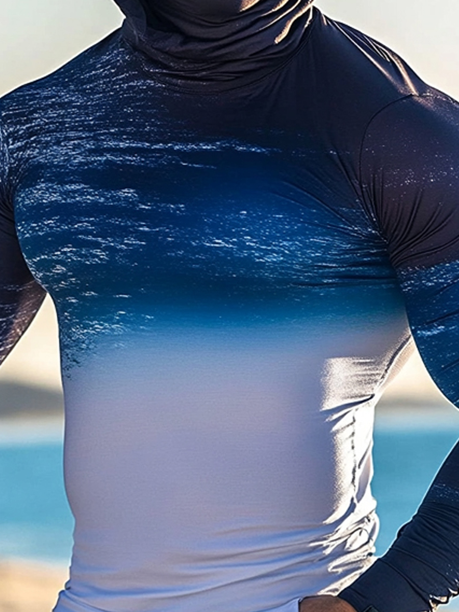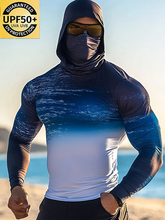 Men's Raglan Sleeve Finger Gloves Face Mask Ombre Ocean Print Sun Protection Hoodie$34.98 USD$43.75 USD