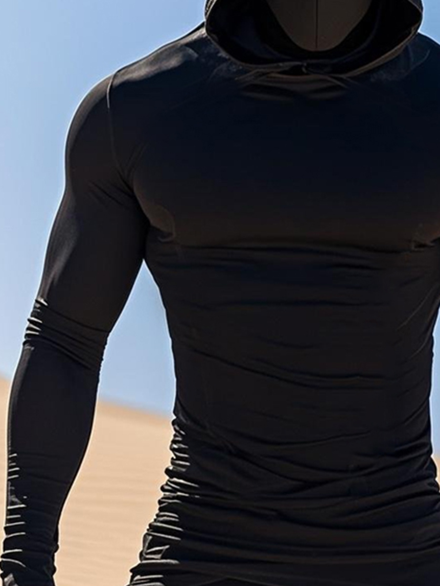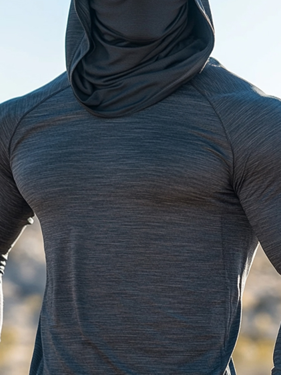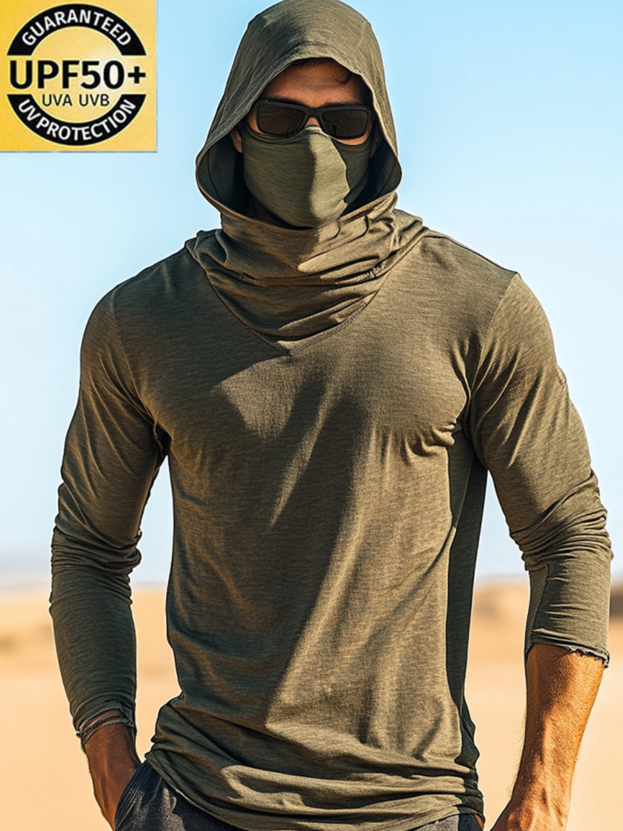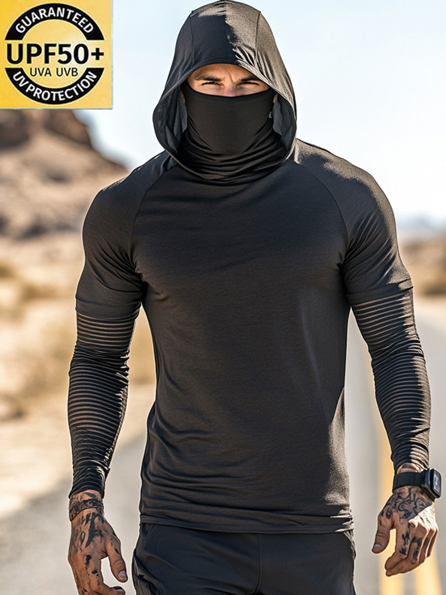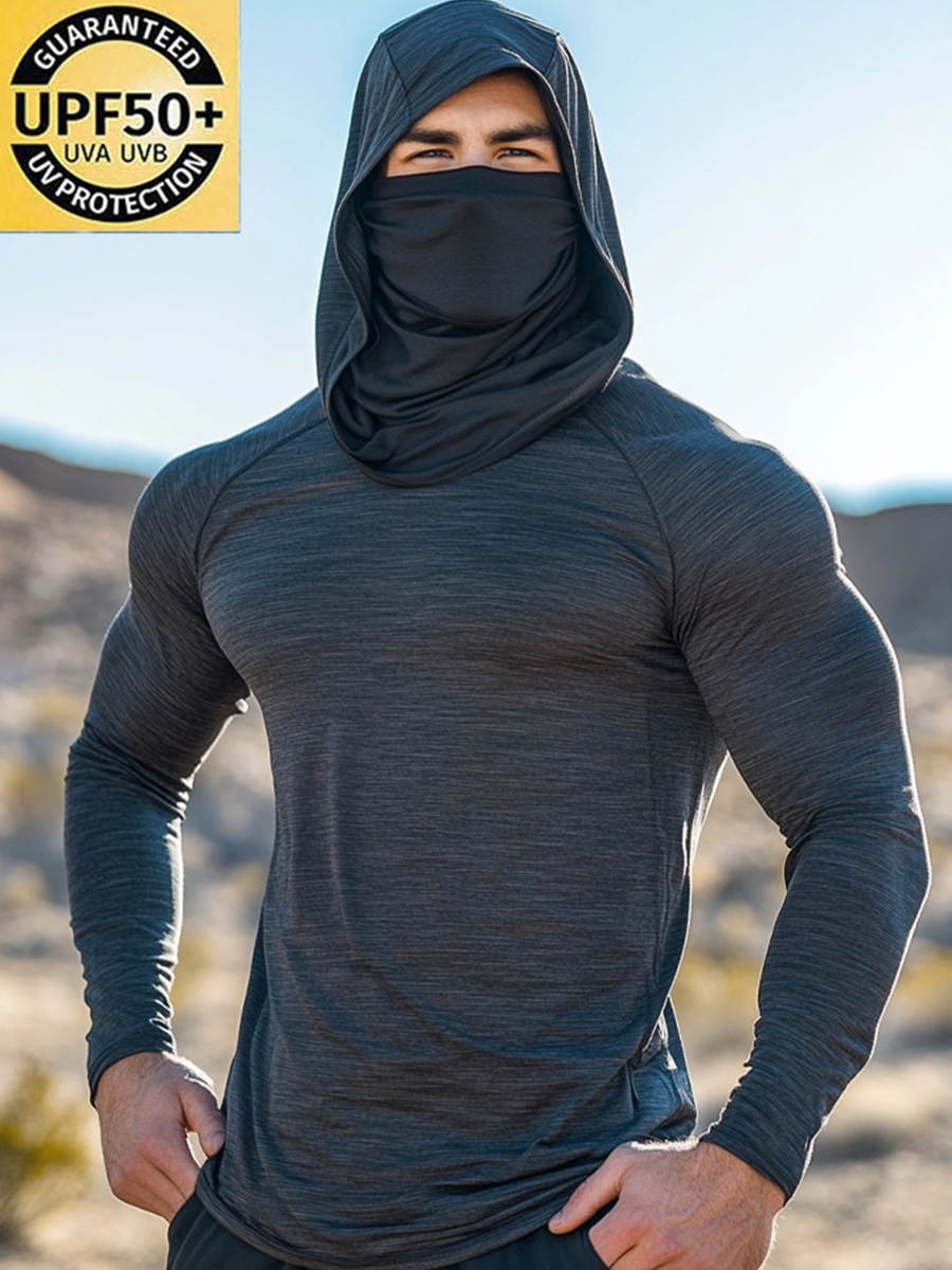 Men's UPF 50+ Hoodie With Built-In Mask - Solid Dark Textured Plain Design - Quick-Dry Performance Sun Protection Hoodie