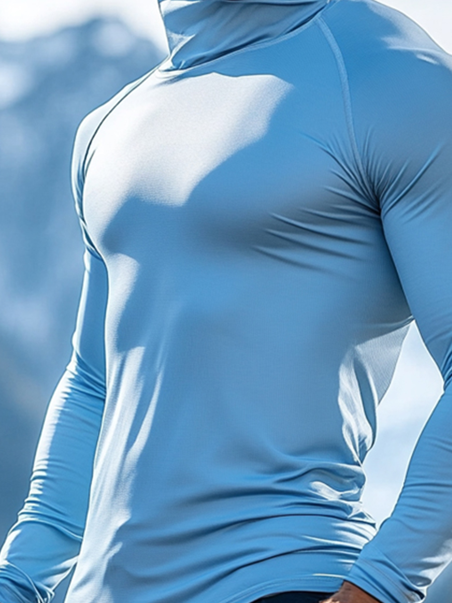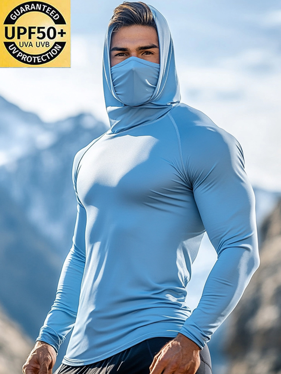Men's UPF 50+ Sun Protection Hoodie with Built-in Face Mask - Solid Light Blue Stretch Fitted - Quick-Drying High-Performance Sun Protection Hoodie