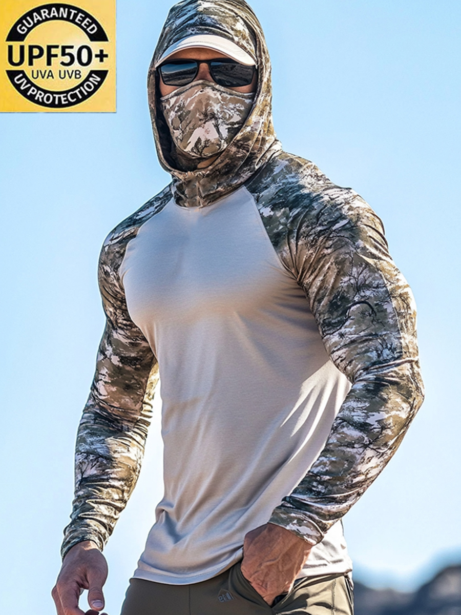 Men's UPF 50+ Sun Protection Hoodie with Built-in Face Mask - Contrast Camo Print Design - Quick-Drying High-Performance Sun Protection Hoodie