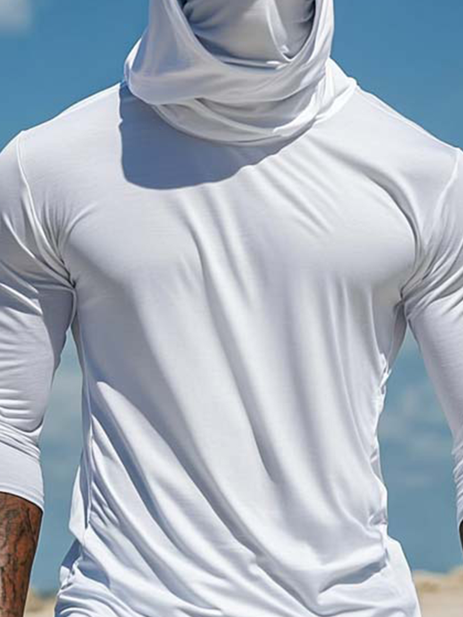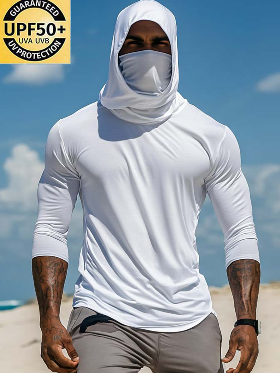 Men's UPF 50+ Sun Protection Hoodie with Built-in Face Mask - Solid Bright White Plain Minimalist - Quick-Drying High-Performance Sun Protection Hoodie