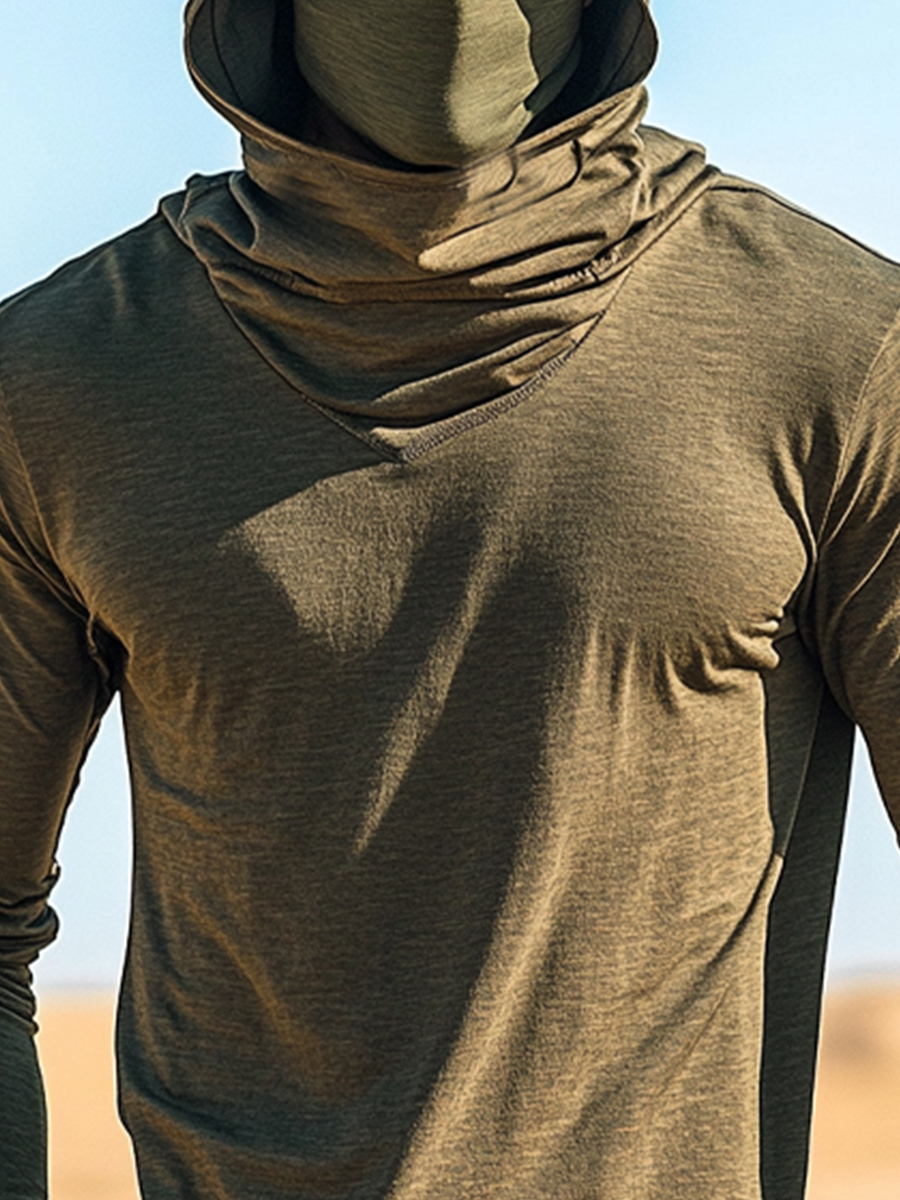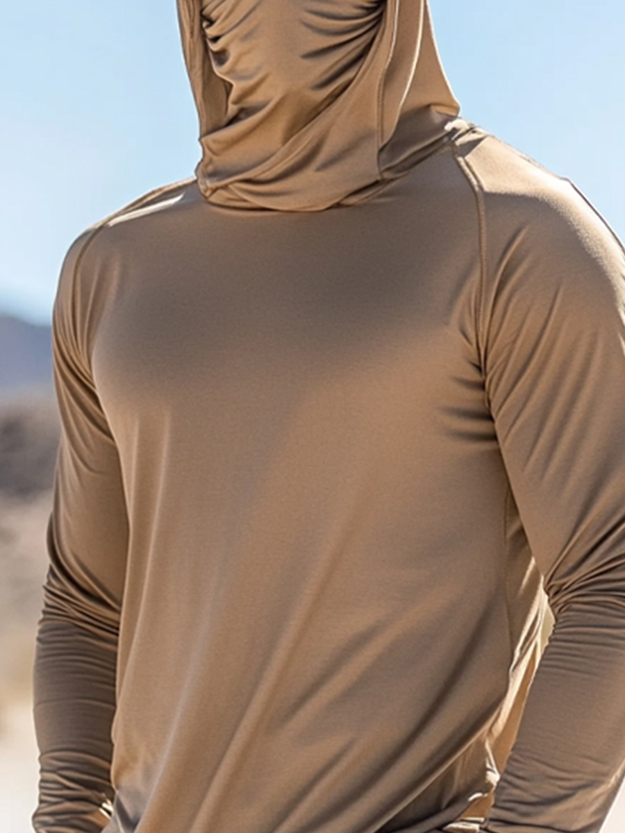 Men's UPF 50+ Sun Protection Hoodie with Built-in Face Mask - Solid Khaki Stretch Fitted - Quick-Drying High-Performance Sun Protection Hoodie