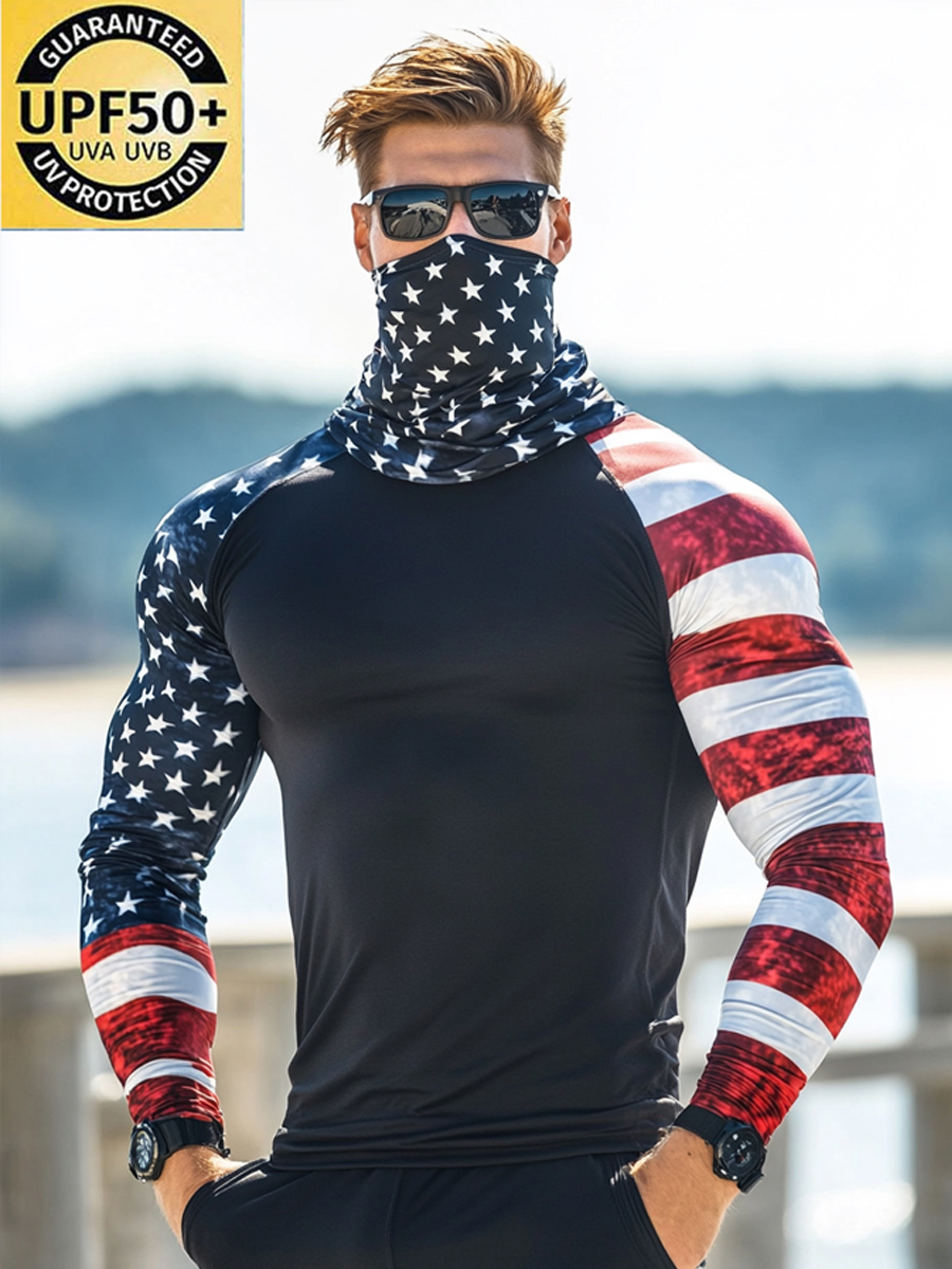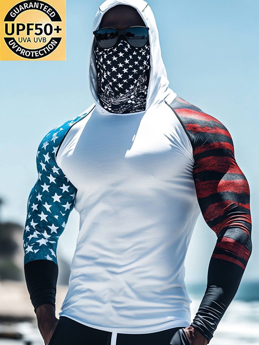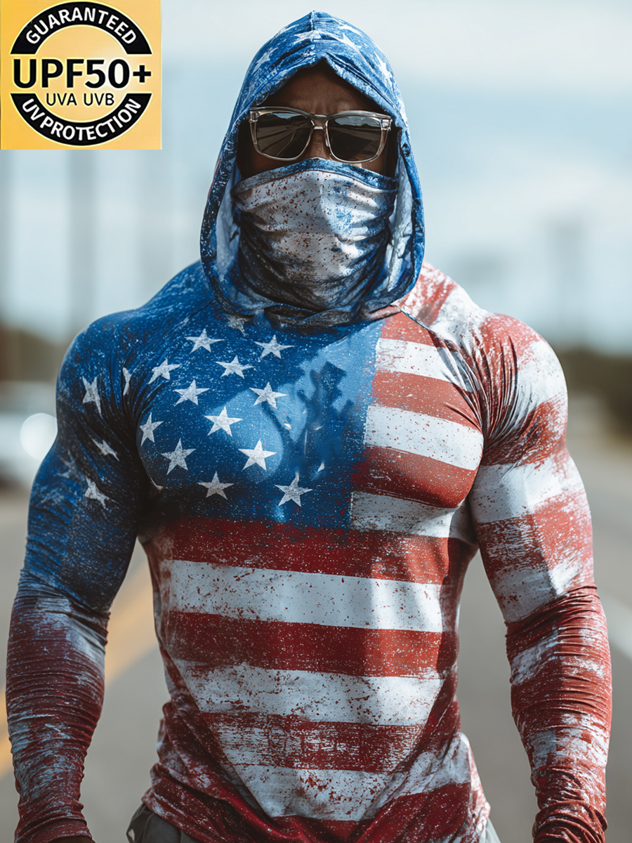 Men's UPF 50+ Sun Protection Hoodie with Built-in Face Mask - Star Stripes Graphic Print Design - Quick-Drying High-Performance Sun Protection Hoodie
