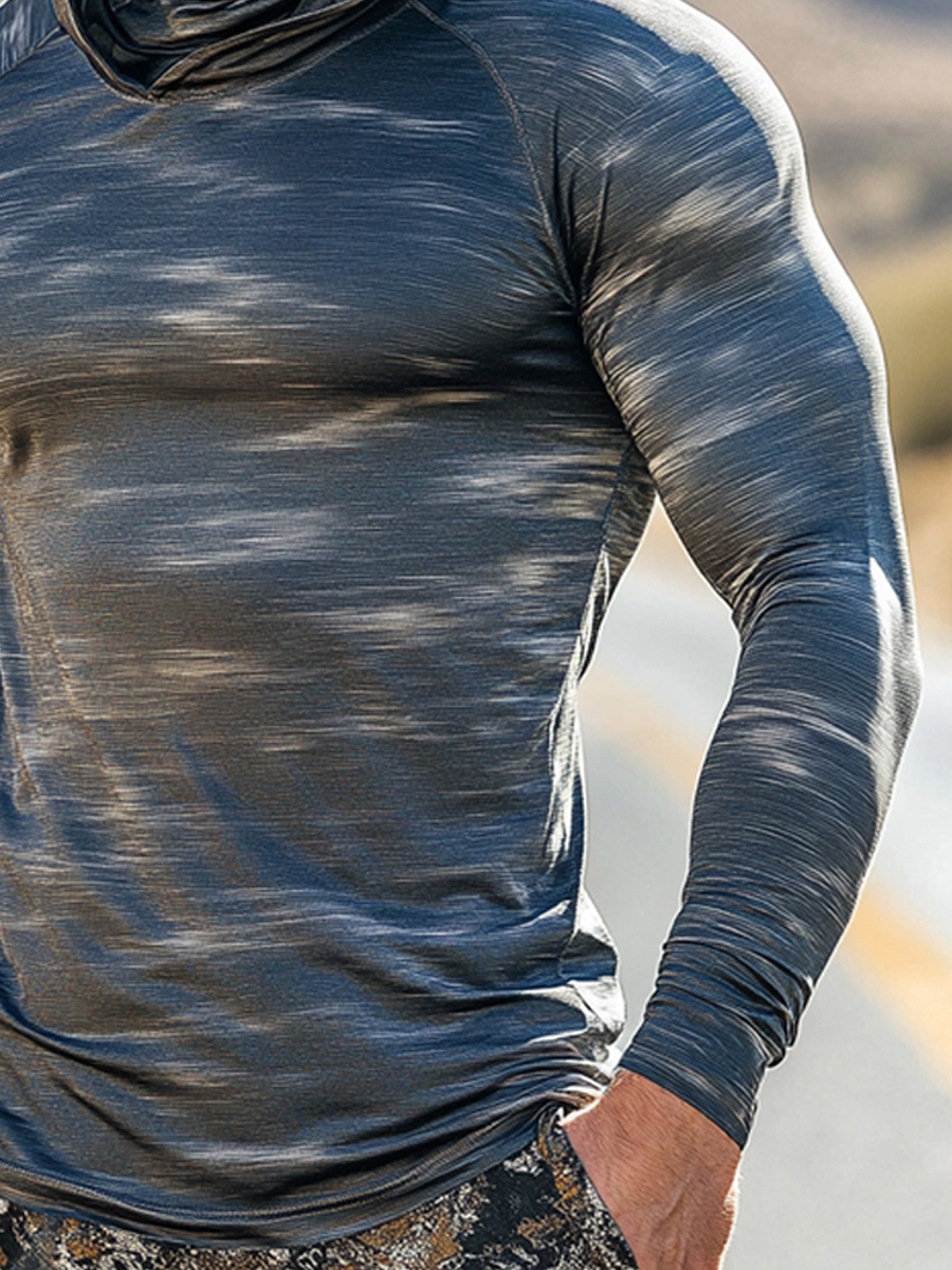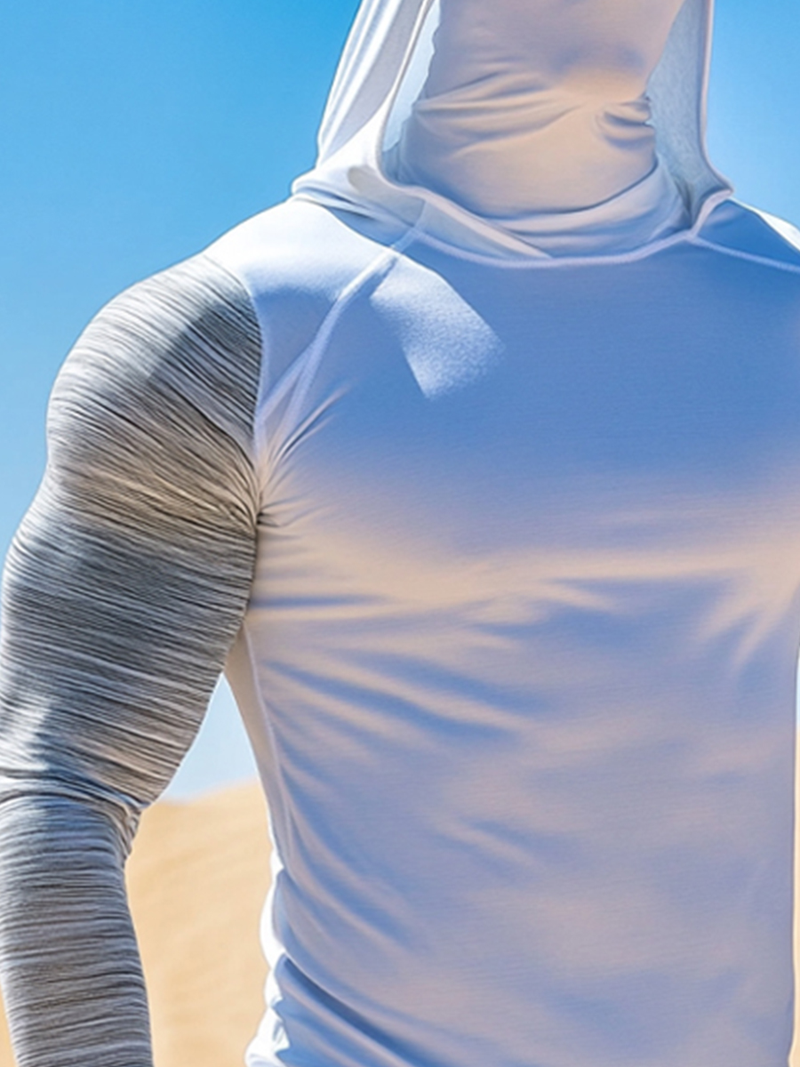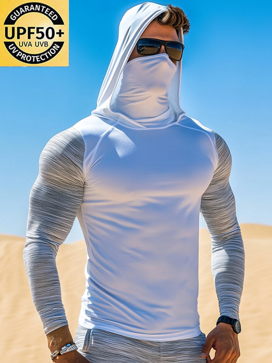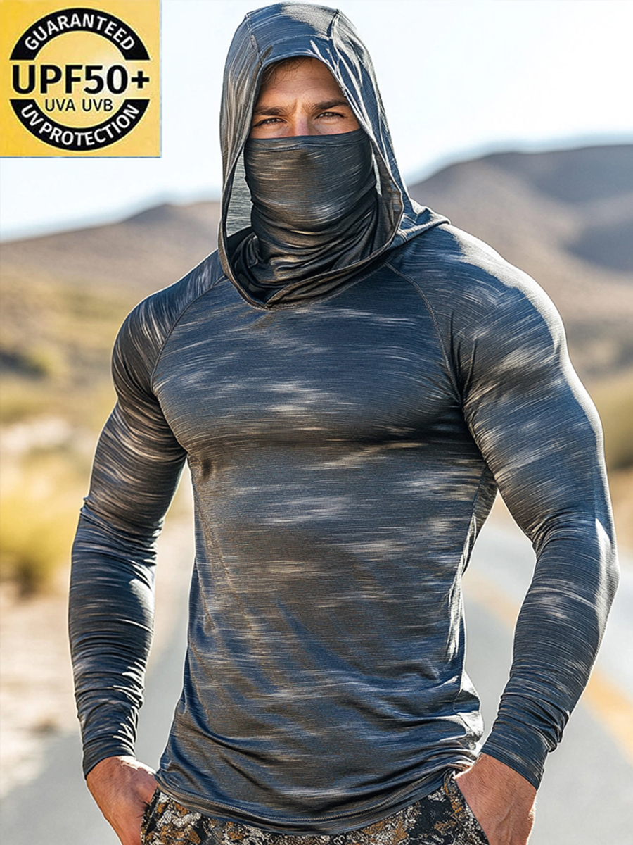 Men's UPF 50+ Hoodie With Built-In Mask - Colorblock Grey Texture Design- Quick-Dry Performance Sun Protection Hoodie