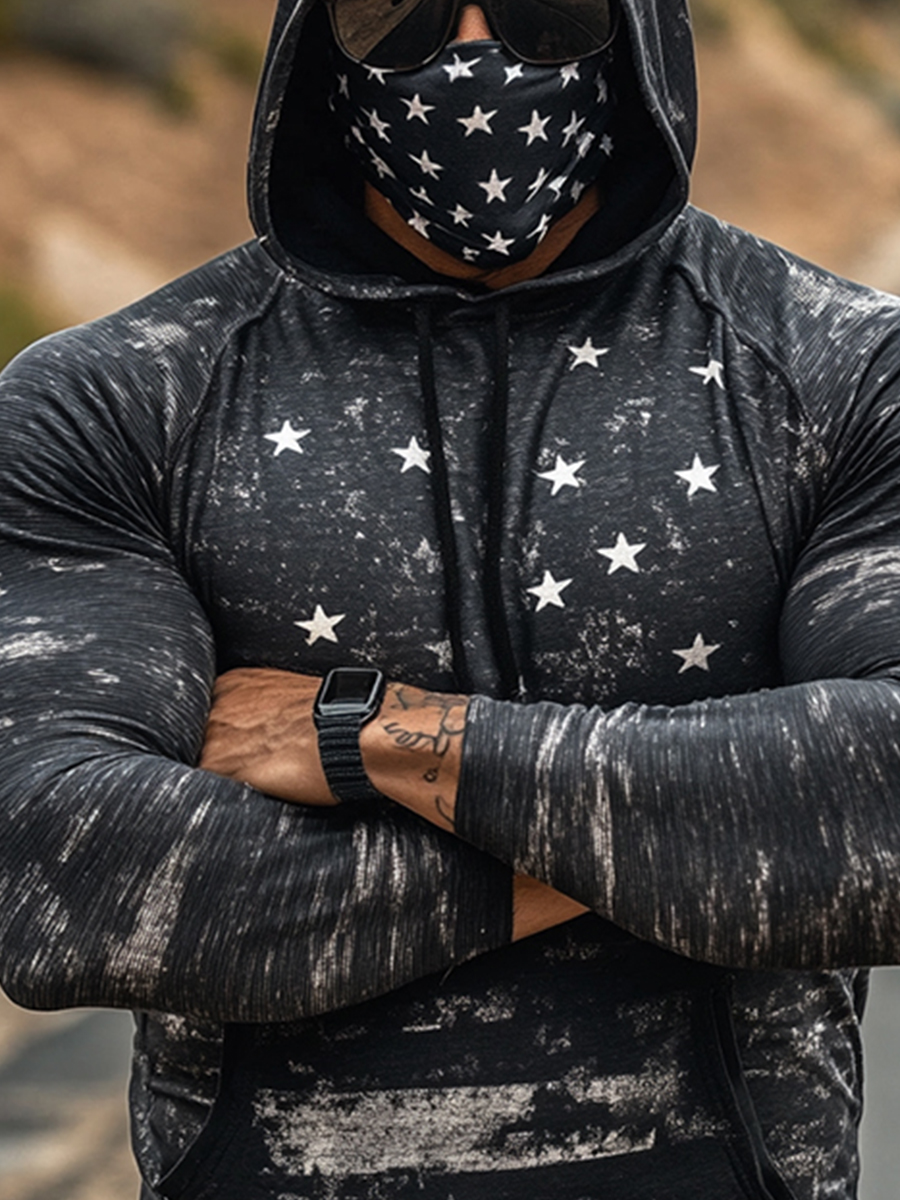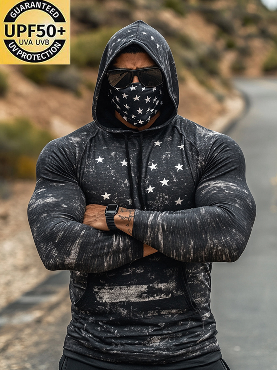 Men's UPF 50+ Hoodie With Built-In Mask - Vintage Star Distressed Graphic Print - Quick-Dry Performance Sun Protection Hoodie