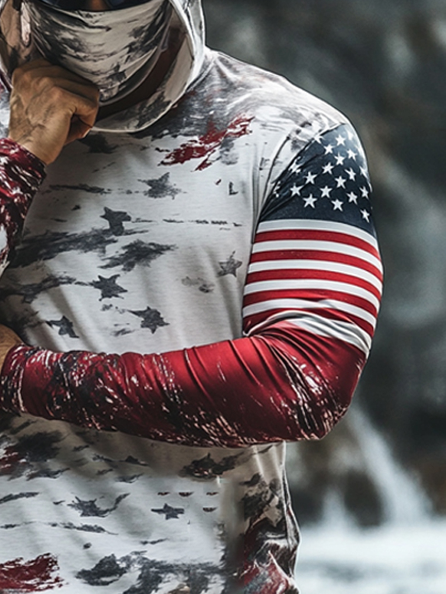 Men's Raglan Sleeve Finger Gloves Face Mask Colorblock Distressed Flag Print Sun Protection Hoodie