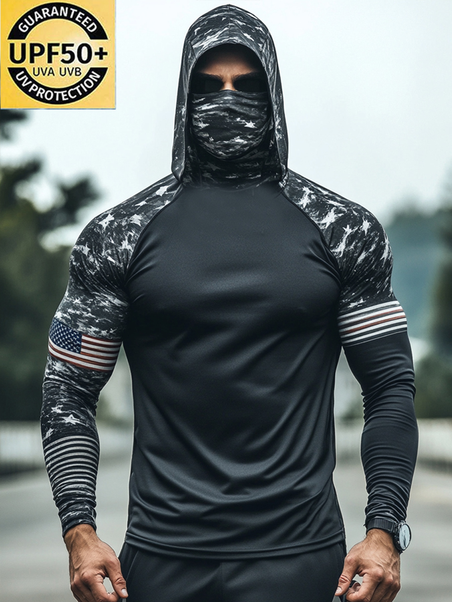 Men'S UPF 50+ Hoodie With Built-In Mask -Raglan Camouflage National Flag Pattern- Quick-Dry Performance Sun Hoodie