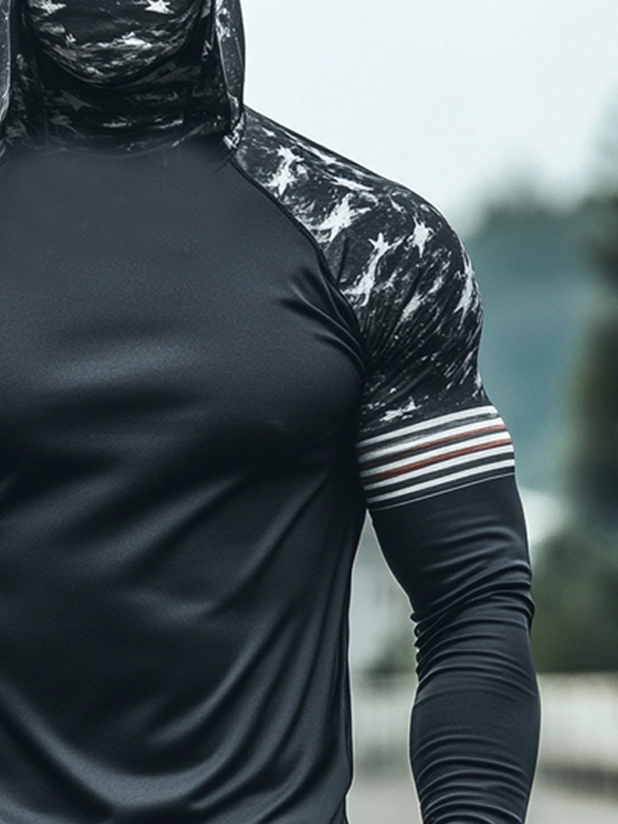 Men's Raglan Sleeve Finger Gloves Face Mask Black Body Star Stripes Flag Print Sun Protection Hoodie