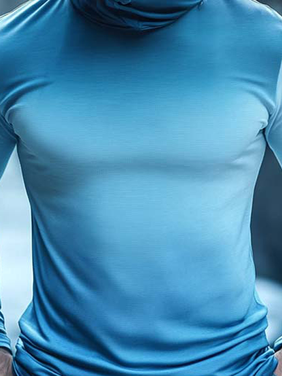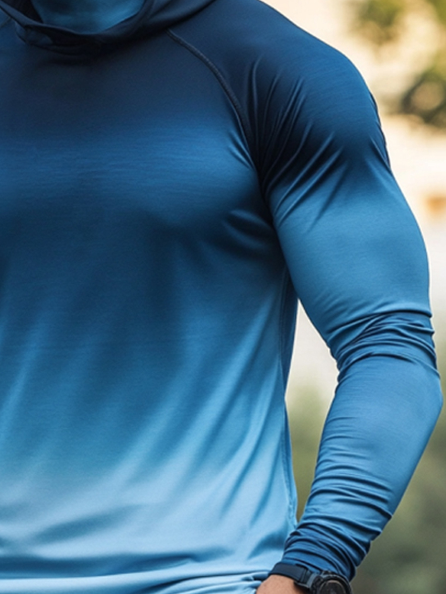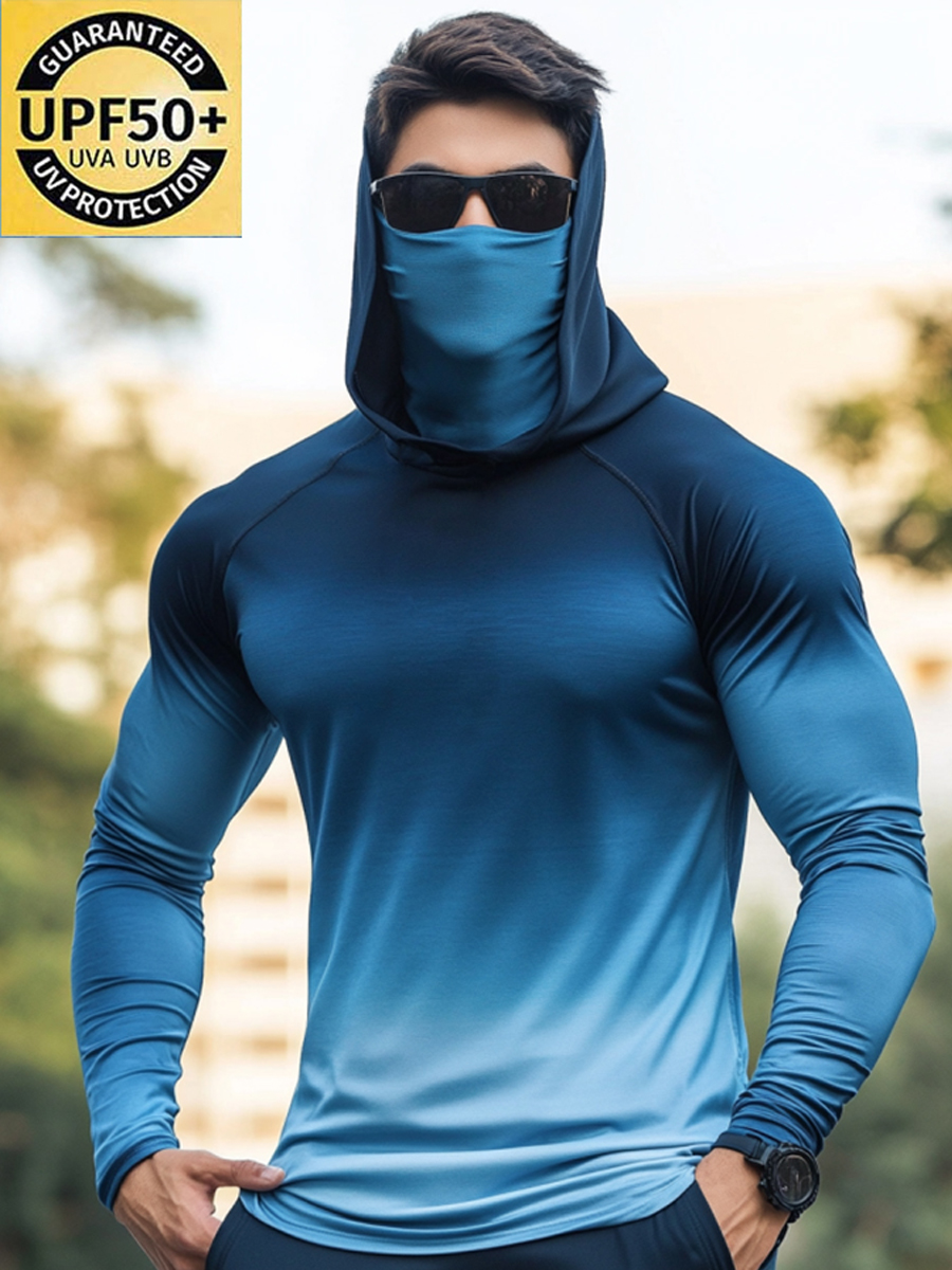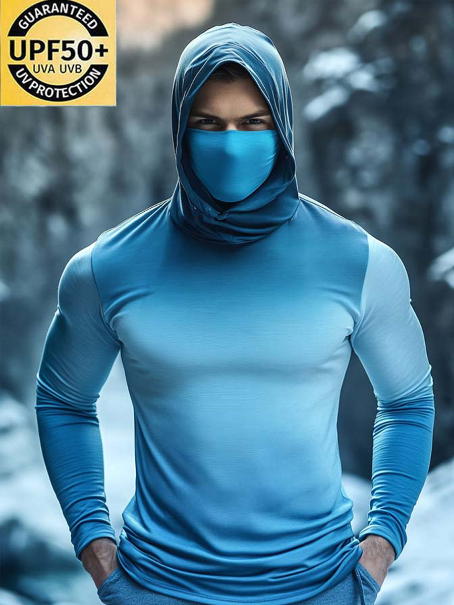 Men's Raglan Sleeve Finger Gloves Face Mask Blue Gradient Ombre Solid Print Sun Protection Hoodie