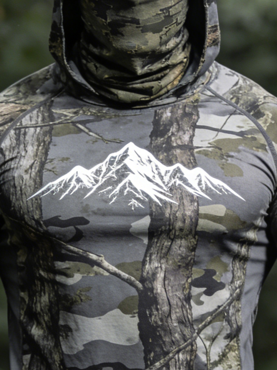 Men's Raglan Sleeve Finger Gloves Face Mask Forest Camo Snow Mountain Graphic Print Sun Protection Hoodie