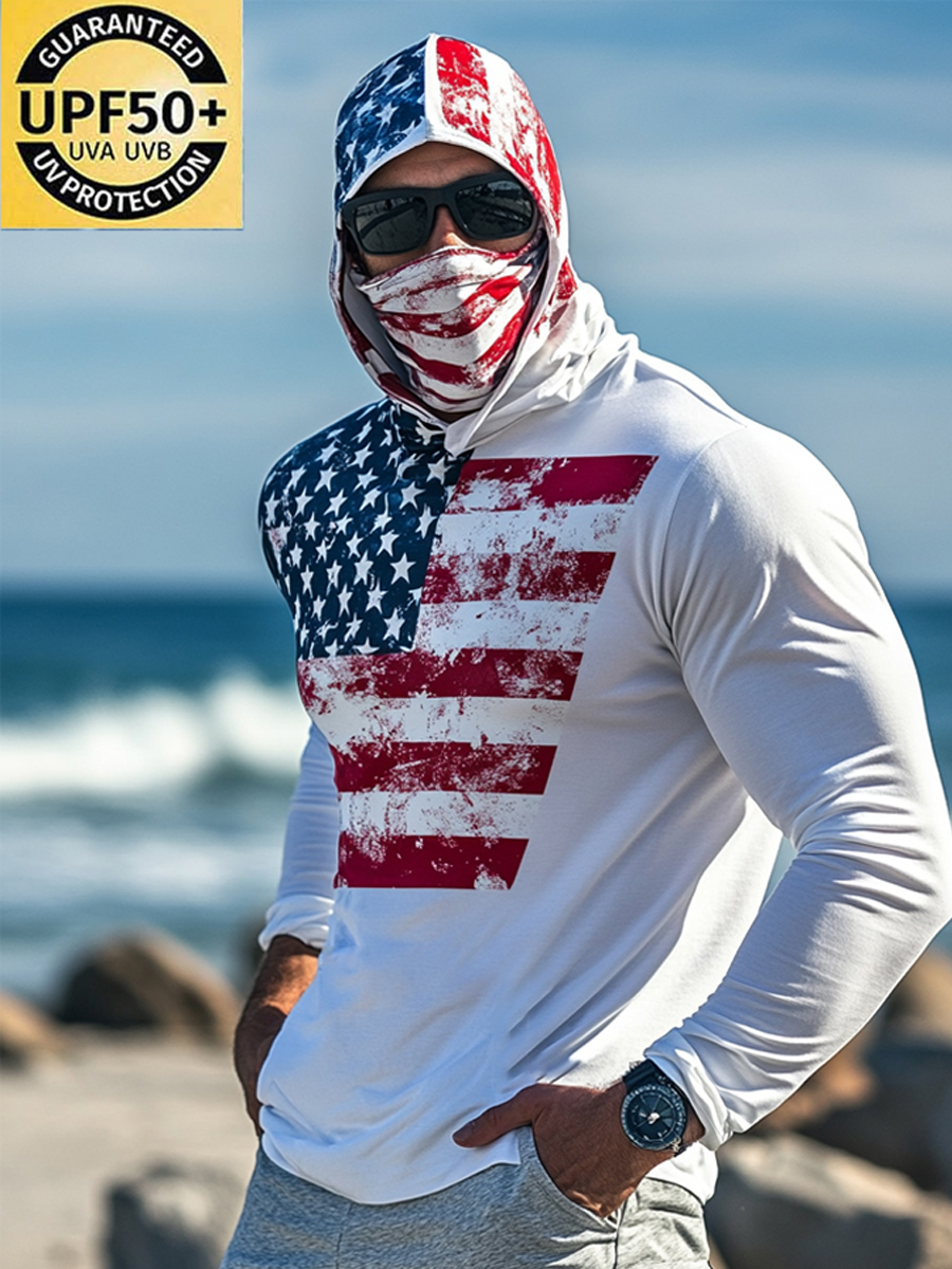 Men's Raglan Sleeve Finger Gloves Face Mask White Base Patriotic Flag Print Sun Protection Hoodie