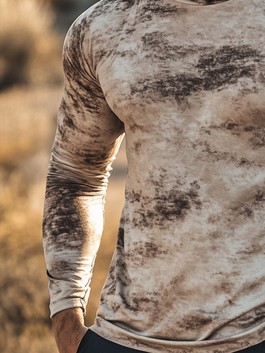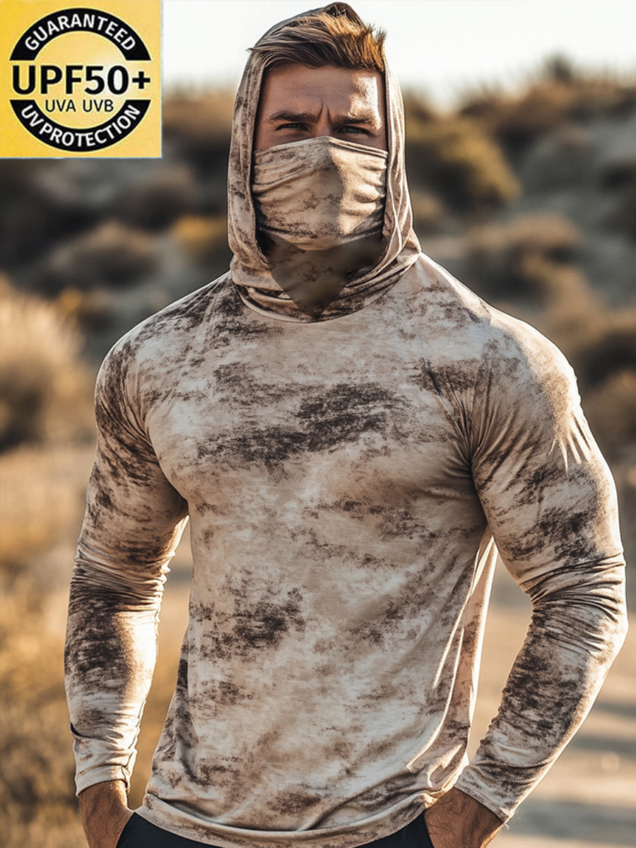 Men's Raglan Sleeve Finger Gloves Face Mask Desert Vintage Tie Dye Distressed Texture Print Sun Protection Hoodie