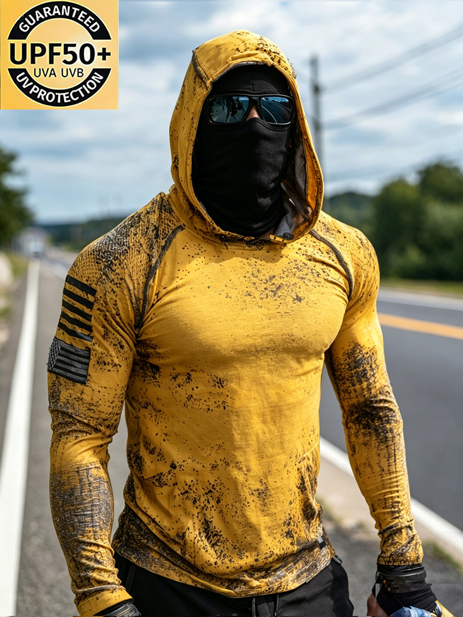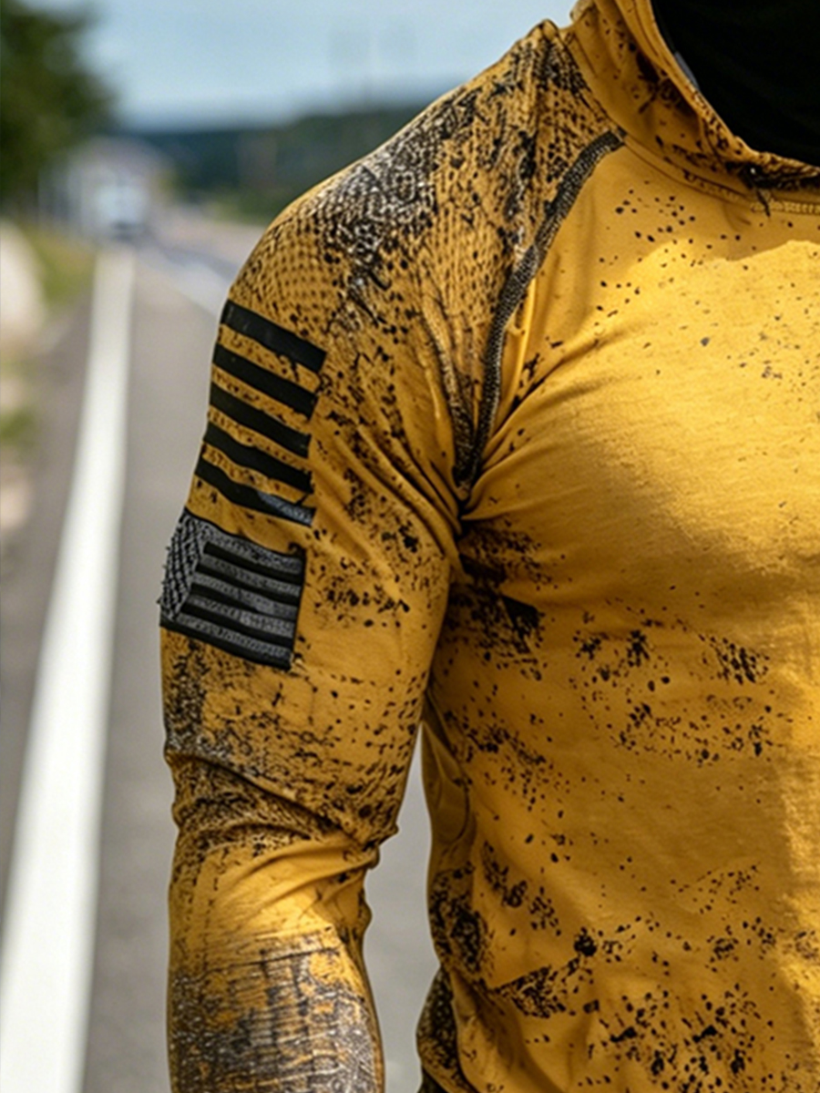 Men's Outdoor Sun Protection Breathable Cool Mask Yellow Black Splatter American Flag Print Hooded Sun Protection Long Sleeve Top