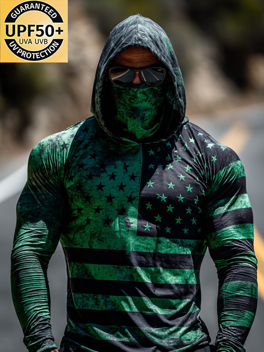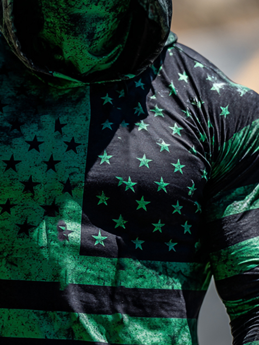 Men's Outdoor Sun Protection Breathable Cool Mask Black Green Vintage Distressed Flag Star Stripes Print Hooded Sun Protection Long Sleeve Top