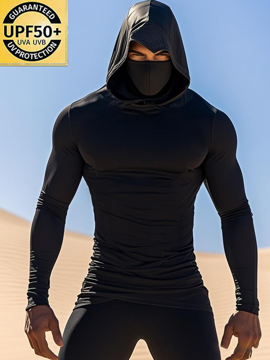 Men's UPF 50+ Sun Protection Hoodie with Built-in Face Mask - Solid Black Stretch Fitted - Quick-Drying High-Performance Sun Protection Hoodie