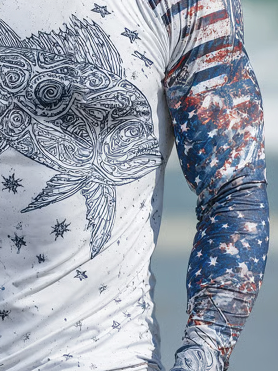 Men's Raglan Sleeve Finger Gloves American Flag Fish Print Sun Protection Hoodie