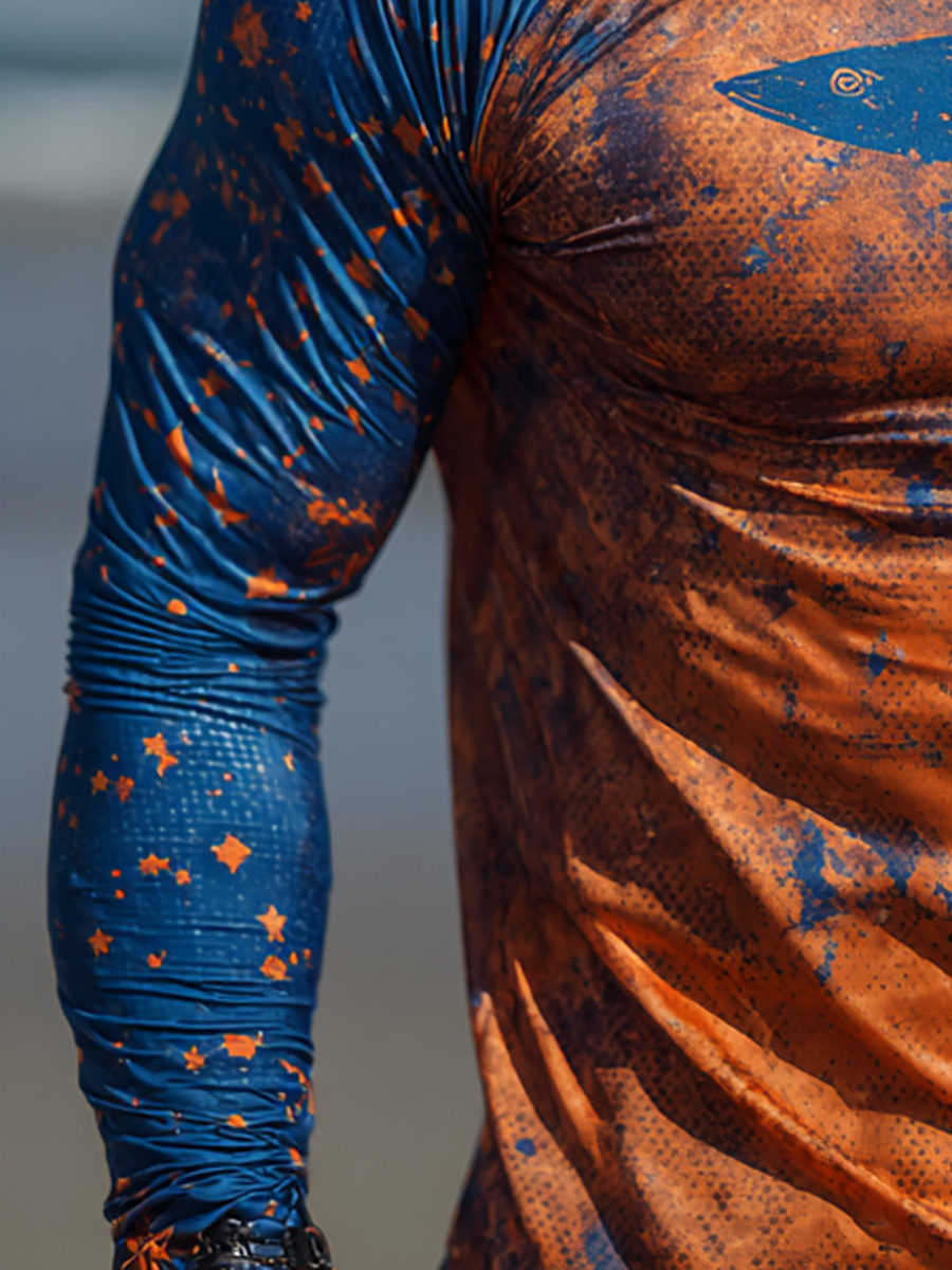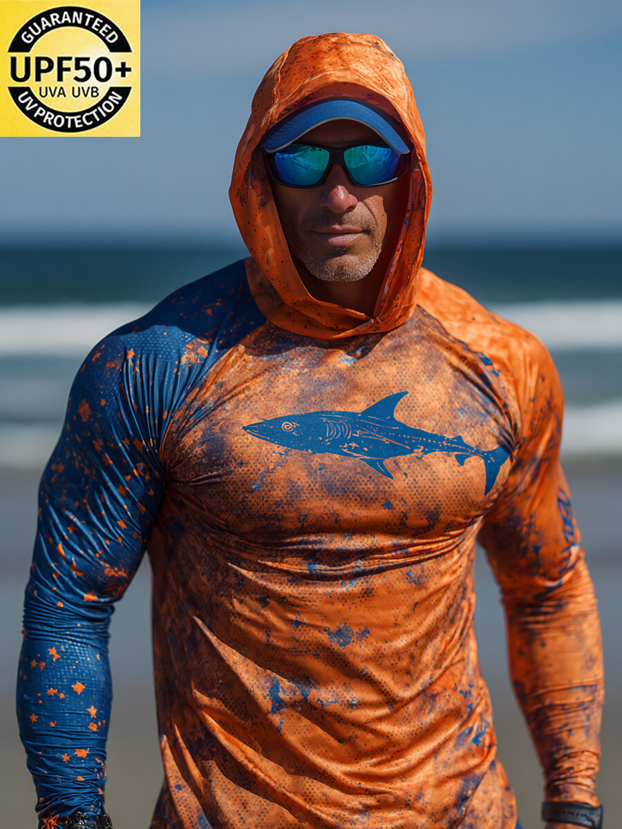 Men'S UPF 50+ Fishing Hoodie With Built-In Mask -Orange Splatter Shark Pattern- Quick-Dry Performance Sun Hoodie