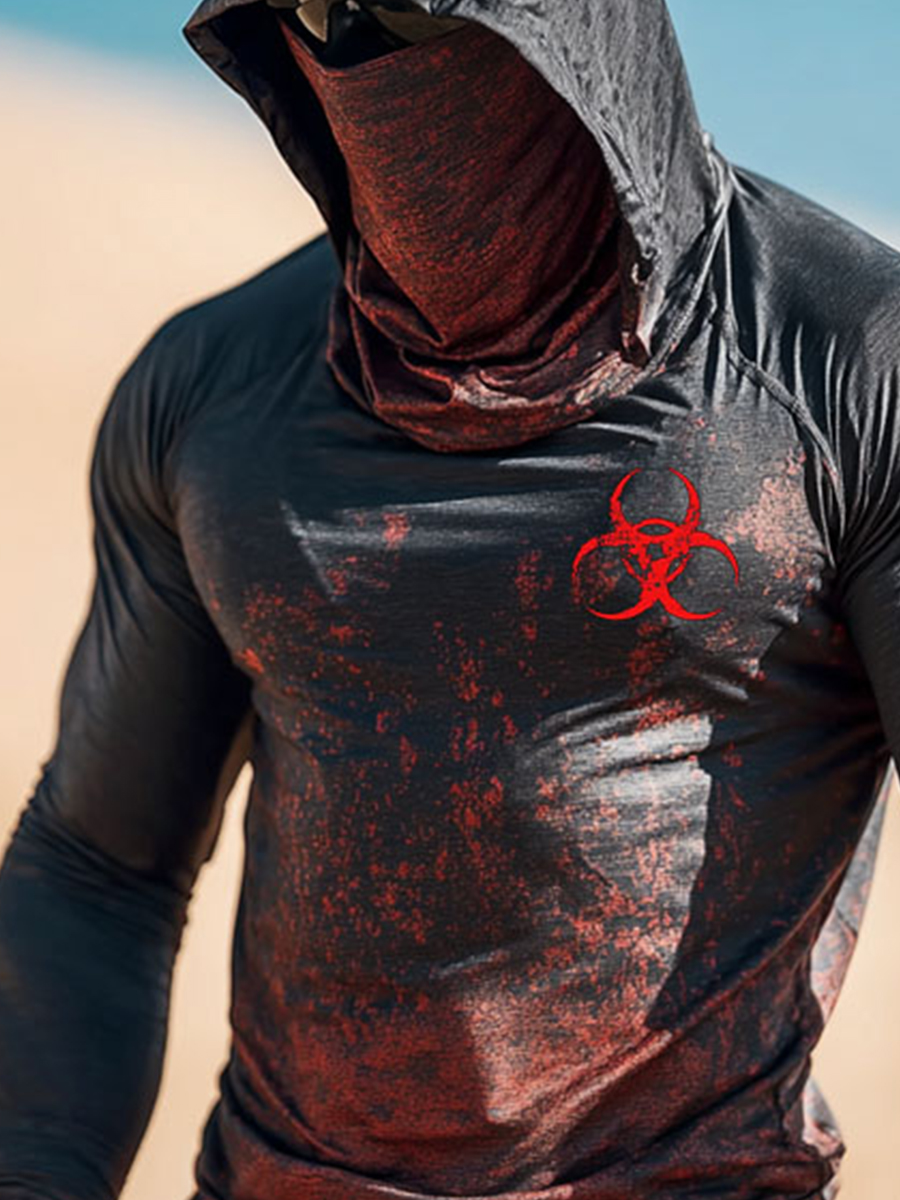 Men's UPF 50+ Sun Protection Hoodie with Built-in Face Mask - Splatter Gradient Red Biohazard Symbol Graphic Print - Quick-Drying High-Performance Sun Protection Hoodie
