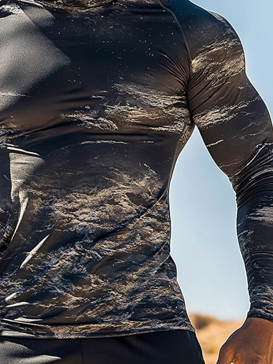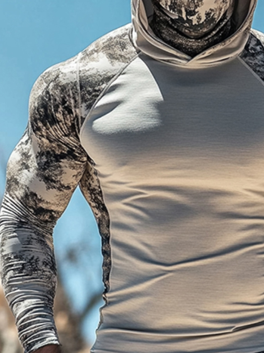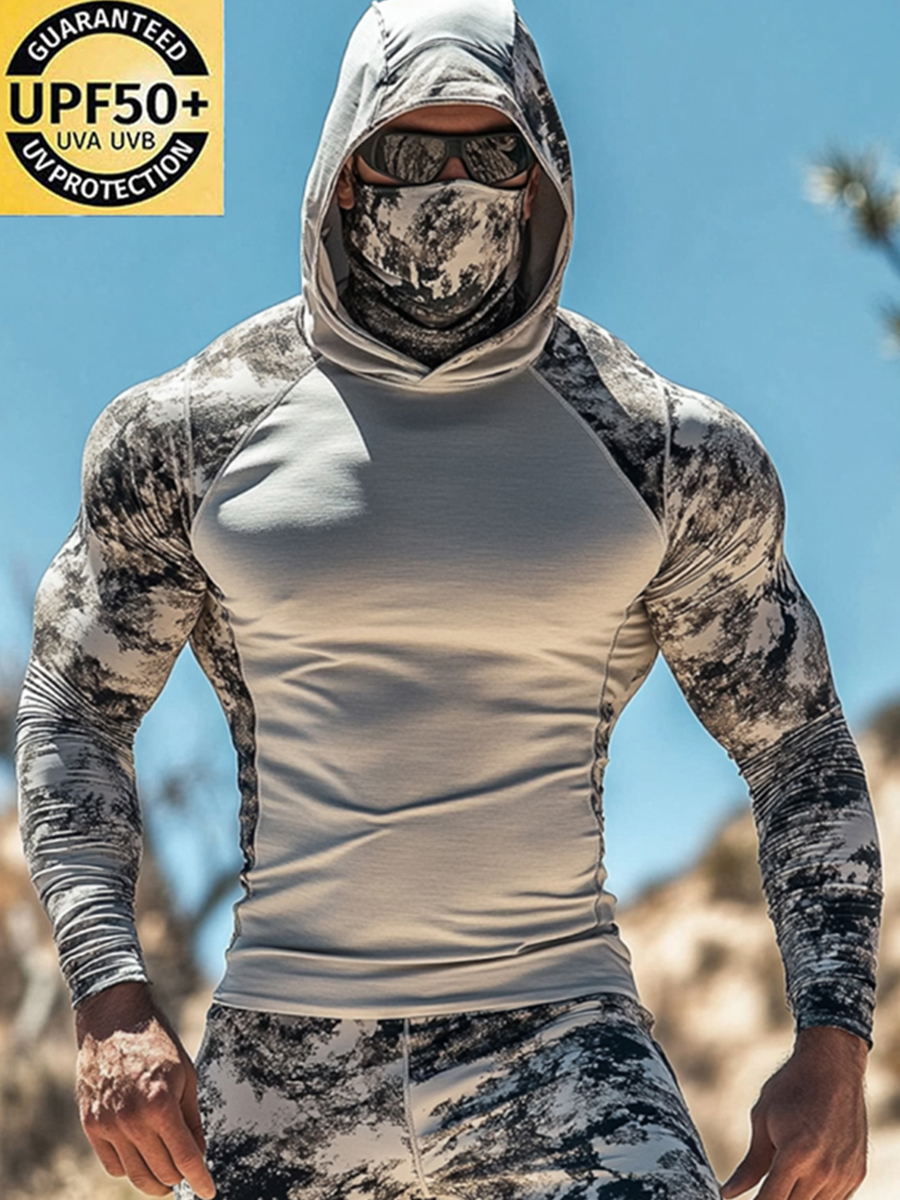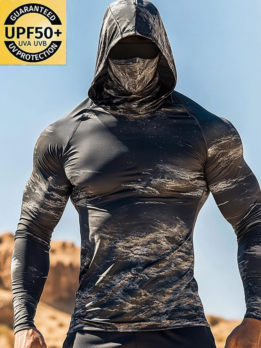 Men's UPF 50+ Hoodie With Built-In Mask - Distressed Camo Splice Print - Quick-Dry Performance Sun Protection Hoodie
